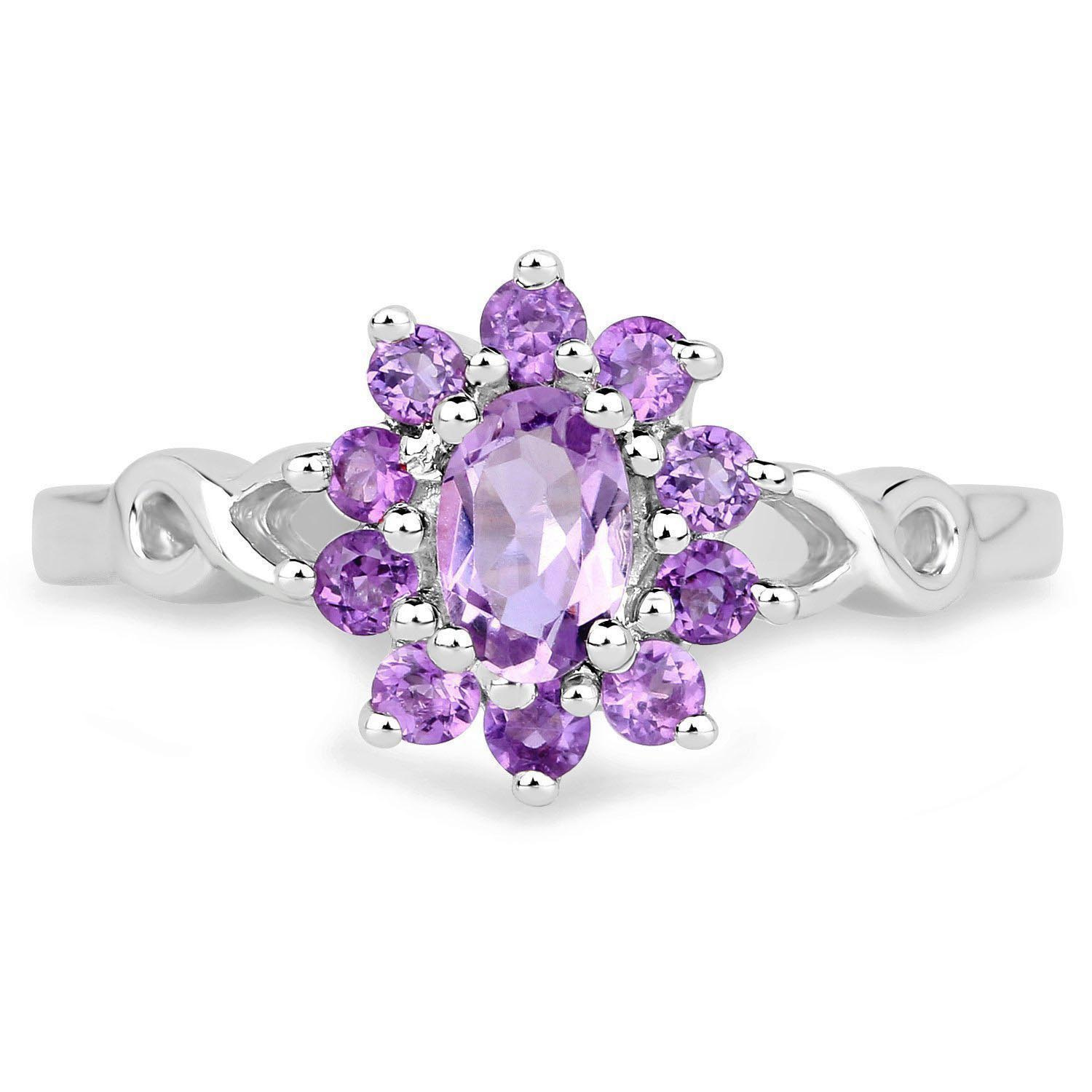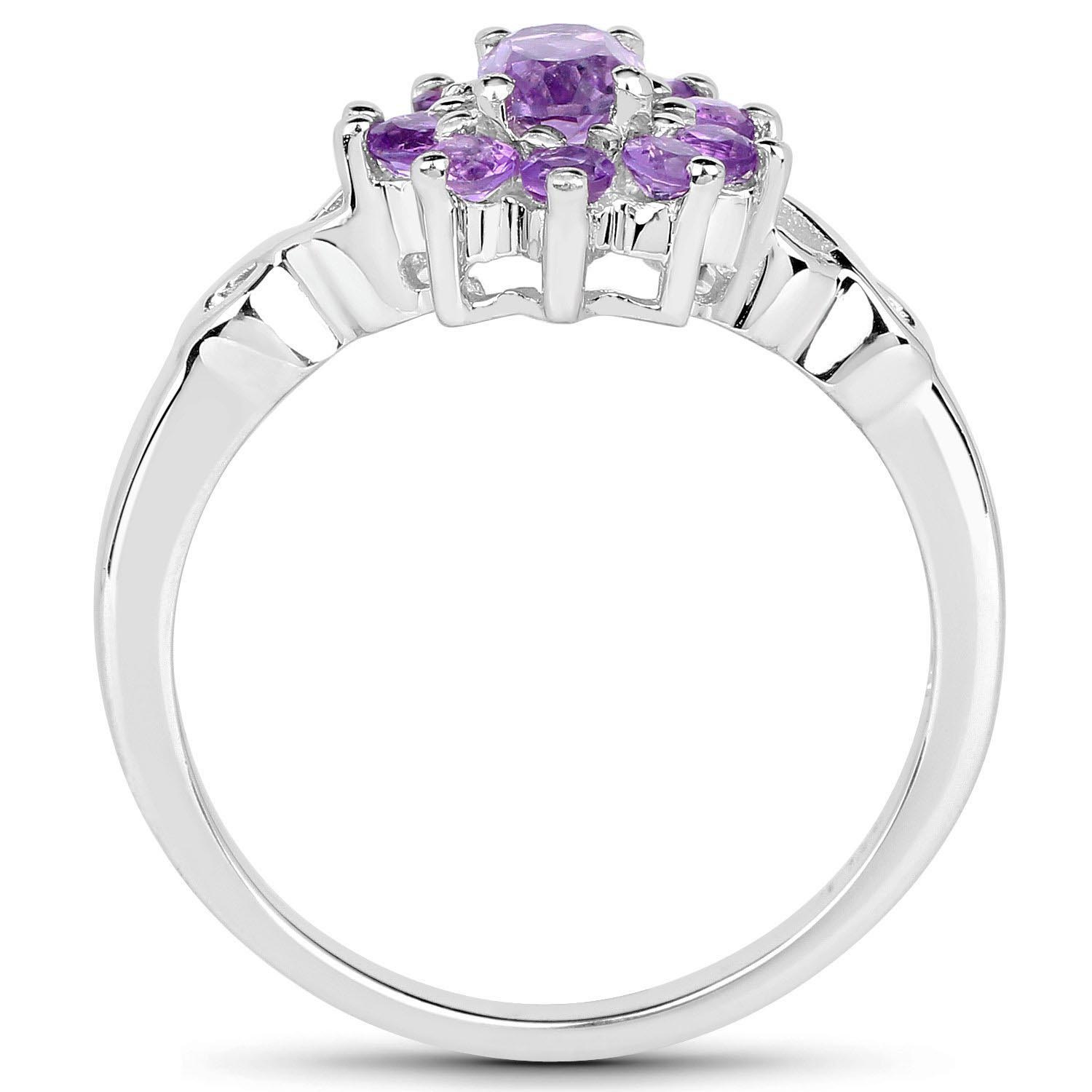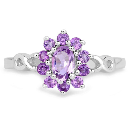Naturalny ametyst (w centrum): Ilość/Waga: 1/0.45 ct, Kształt/Wielkość: Owalny/6x4 mmNaturalny ametyst: Ilość/Waga: 10/0.60 ct, Kształt/Wielkość: Okrągły/2.3 mmWielkość korony pierścionka: ok. 11x11 mmWłaściwości kamieni