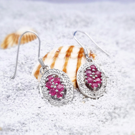 Wiszące srebrne kolczyki z rodowanego srebra próby 925 z 8 naturalnymi rubinami o przepięknej różowej barwie oraz 14 lśniącymi kryształami górskimi.