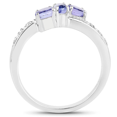 Elegancki i oryginalny srebrny pierścionek z 3 naturalnymi tanzanitami i 4 diamentami, wykonany z rodowanego srebra próby 925.