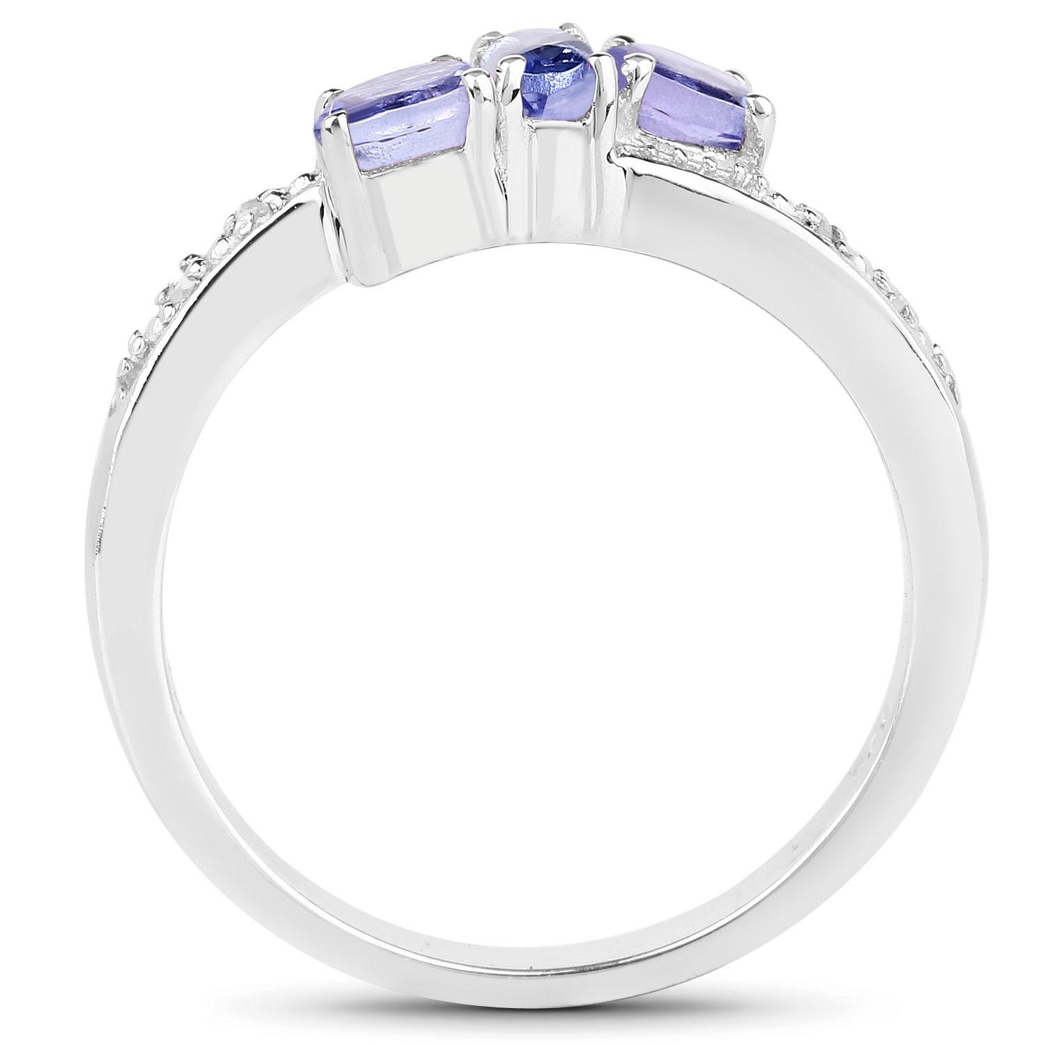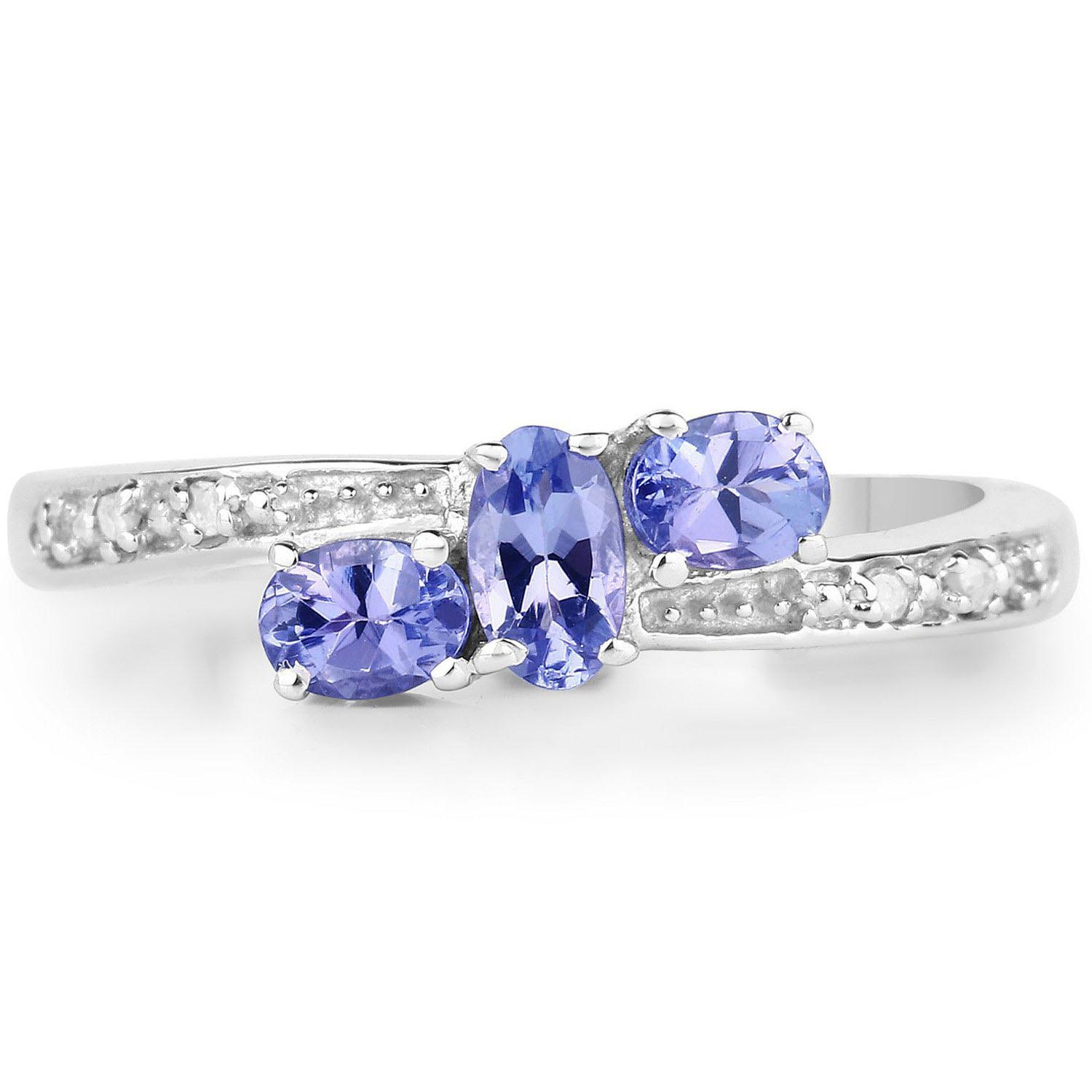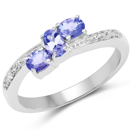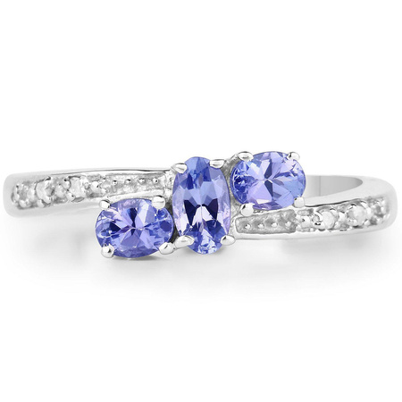 Naturalny tanzanit: Ilość/Waga: 3/0,59 ct, Kształt/Wielkość: Owal/5x3 mm, 4x3 mmNaturalny diament: Ilość/Waga: 4/0.02 ct, Kształt/Wielkość: Okragły/1 mm Wielkość korony pierścionka: ok. 12x6 mmWłaściwości kamieni