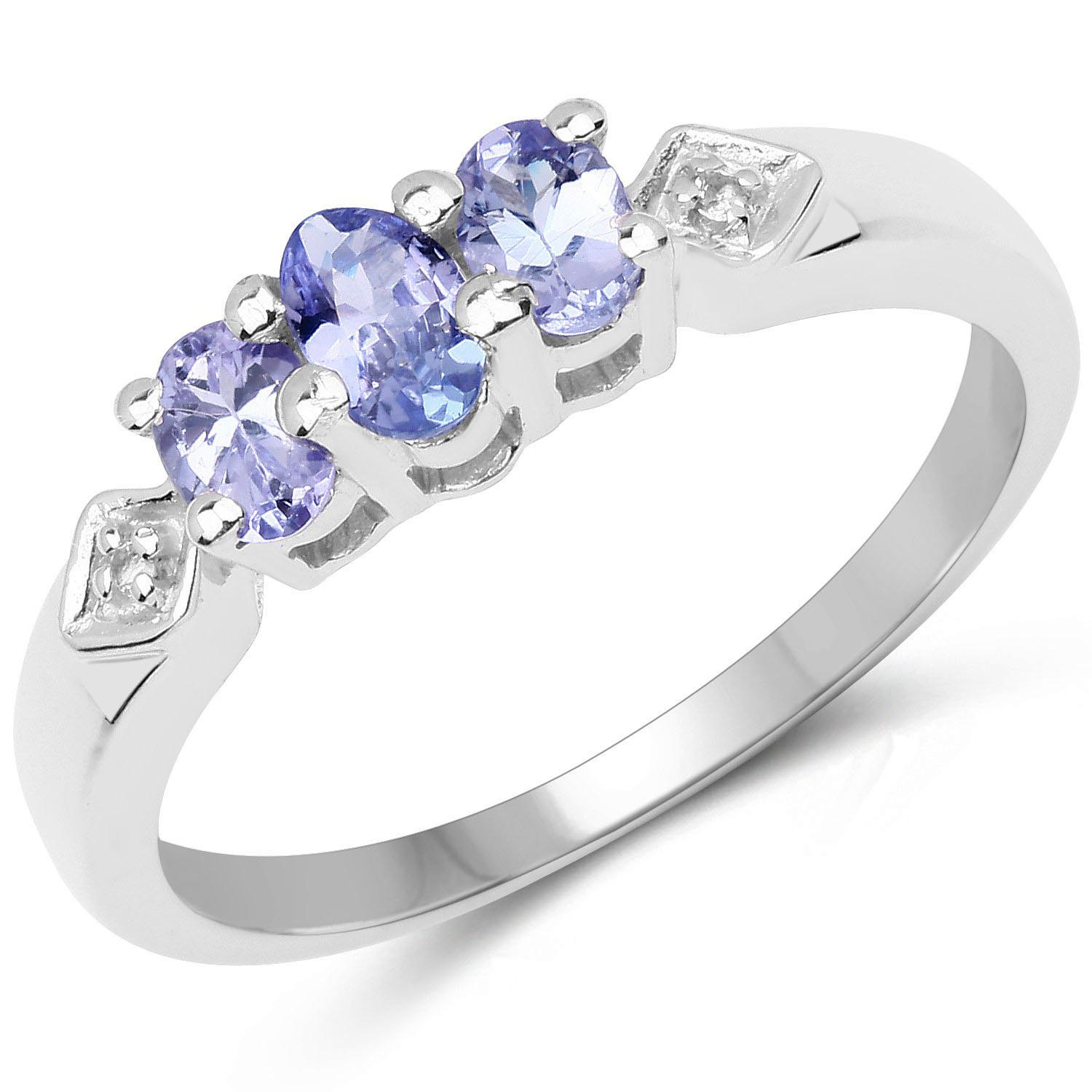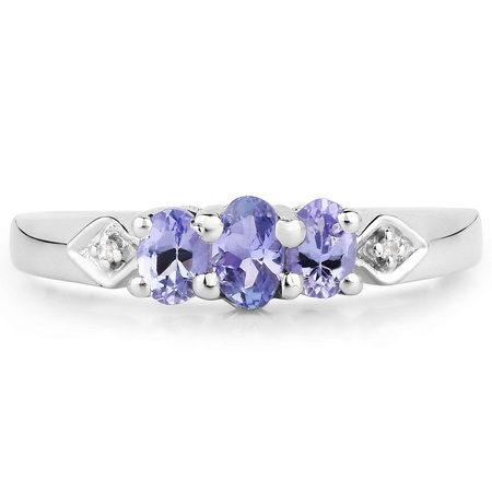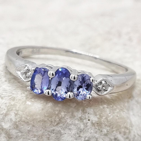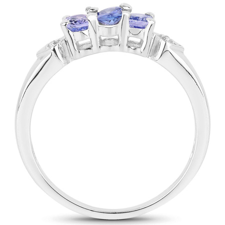 Naturalny tanzanit: Ilość/Waga: 3/0,59 ct, Kształt/Wielkość: Owalny/5x3 mm, 4x3 mmNaturalny kryształ górski: lość/Waga: 2/0,01 ct, Kształt/Wielkość: Okrągły/1mmWielkość korony pierścionka: ok. 5x10 mm