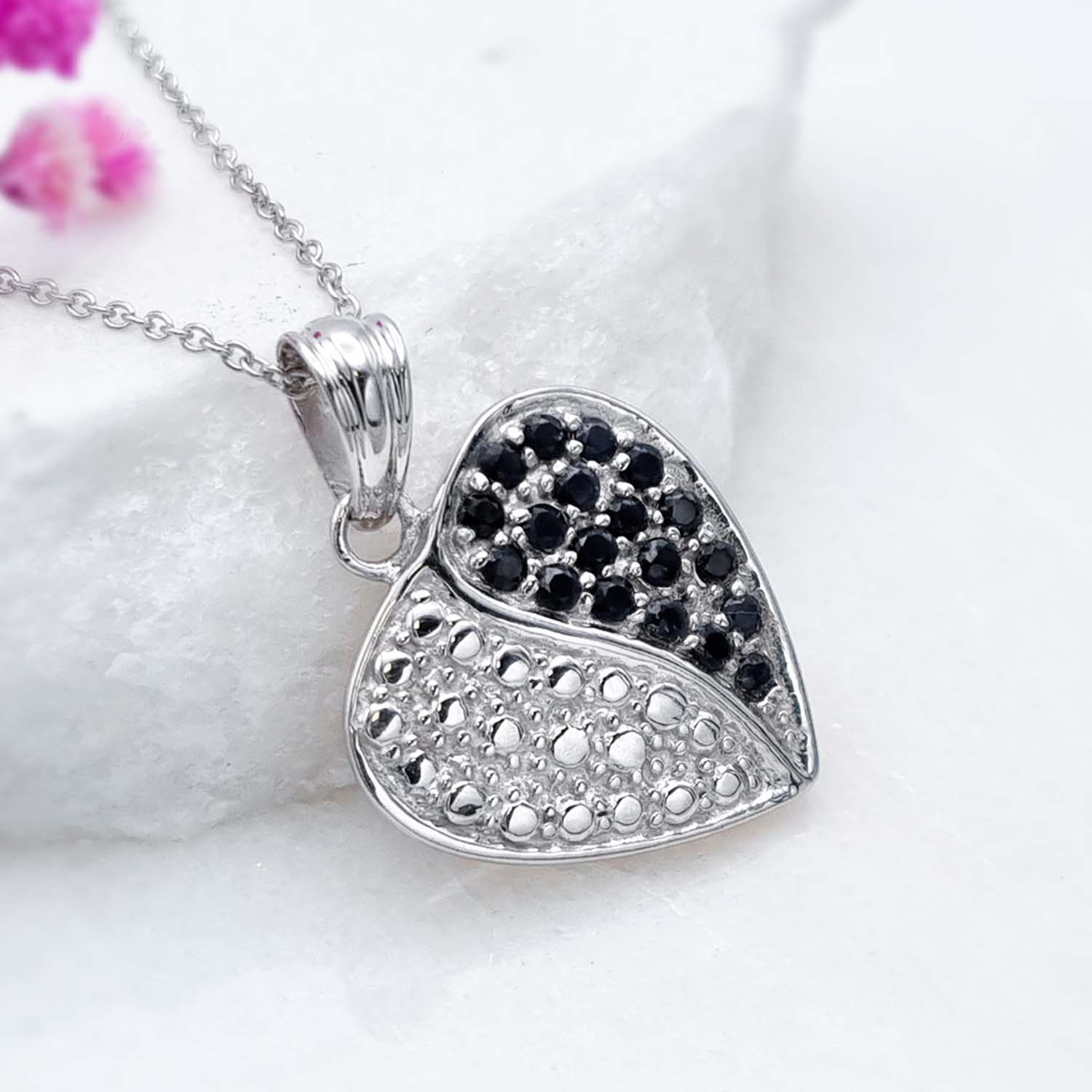 Przykuwający uwagę wisiorek w kształcie serca wykonany z lśniącego rodowanego srebra najwyższej próby 925, wysadzany 19 pięknymi naturalnymi szafirami niebieskimi.