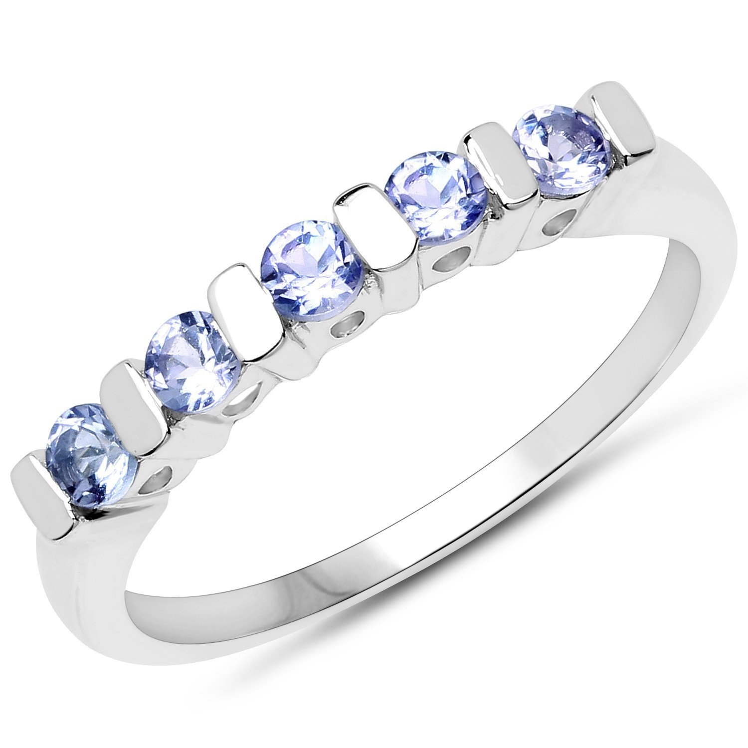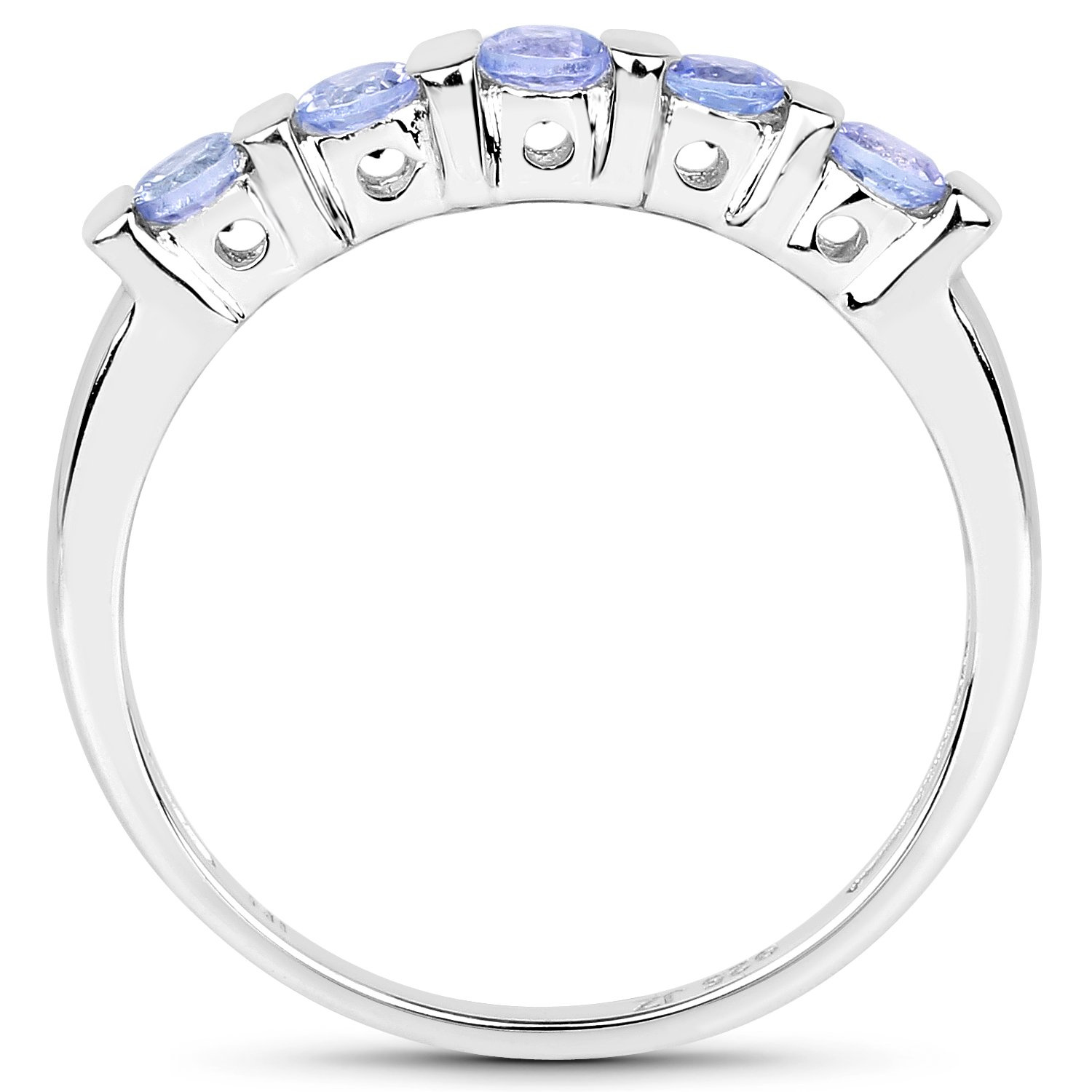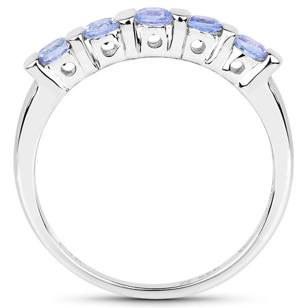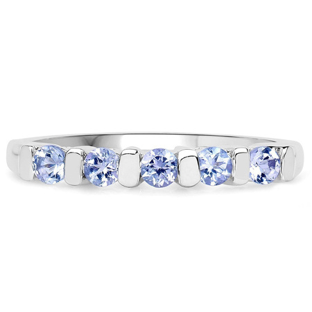 Delikatny i zarazem bardzo gustowny pierścionek wykonany rodowanego srebra próby 925 z 5 naturalnymi tanzanitami o prześlicznej niebiesko-fiołkowej barwie.