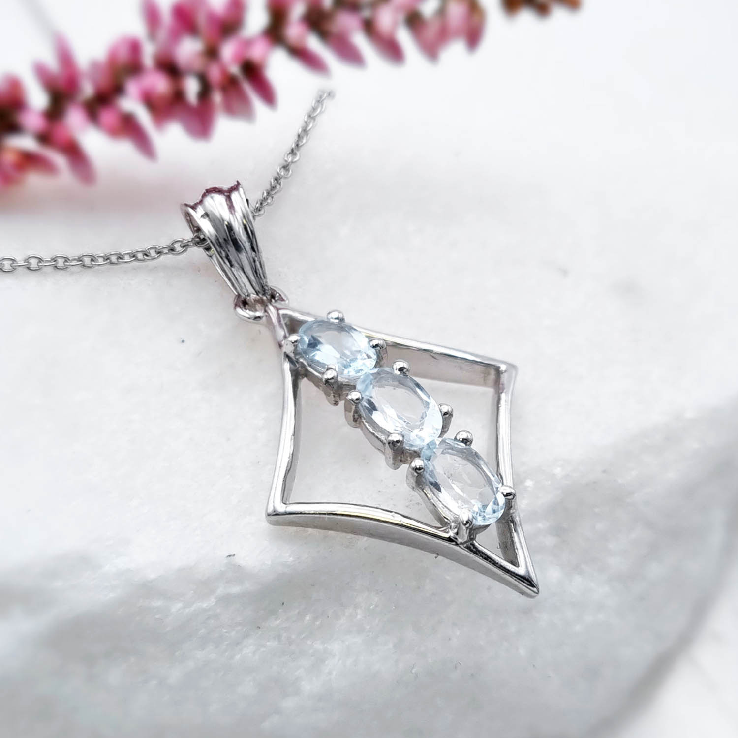 Stylowy wisiorek z 3 naturalnymi topazami niebieskimi, osadzonymi w lśniącym srebrze najlepszej próby 925.