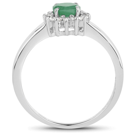 Prześliczny srebrny pierścionek z naturalnym szmaragdem oraz 14 kryształami górskimi, osadzonymi w pięknym rodowanym srebrze najlepszej próby 925.