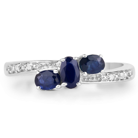 Naturalny szafir niebieski: Ilość/Waga: 3/0.85 ct, Kształt/Wielkość: Owal/5x3 mm, 4x3 mmNaturalny diament: Ilość/Waga: 4/0.02 ct, Kształt/Wielkość: Okragły/1 mm Wielkość korony pierścionka: ok. 12x6 mmWłaściwości kamieni