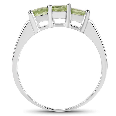 Atrakcyjny srebrny pierścionek z naturalnymi perydotami o przepięknej intensywnej barwie oliwkowej, osadzonymi w lśniącym rodowanym srebrze próby 925.