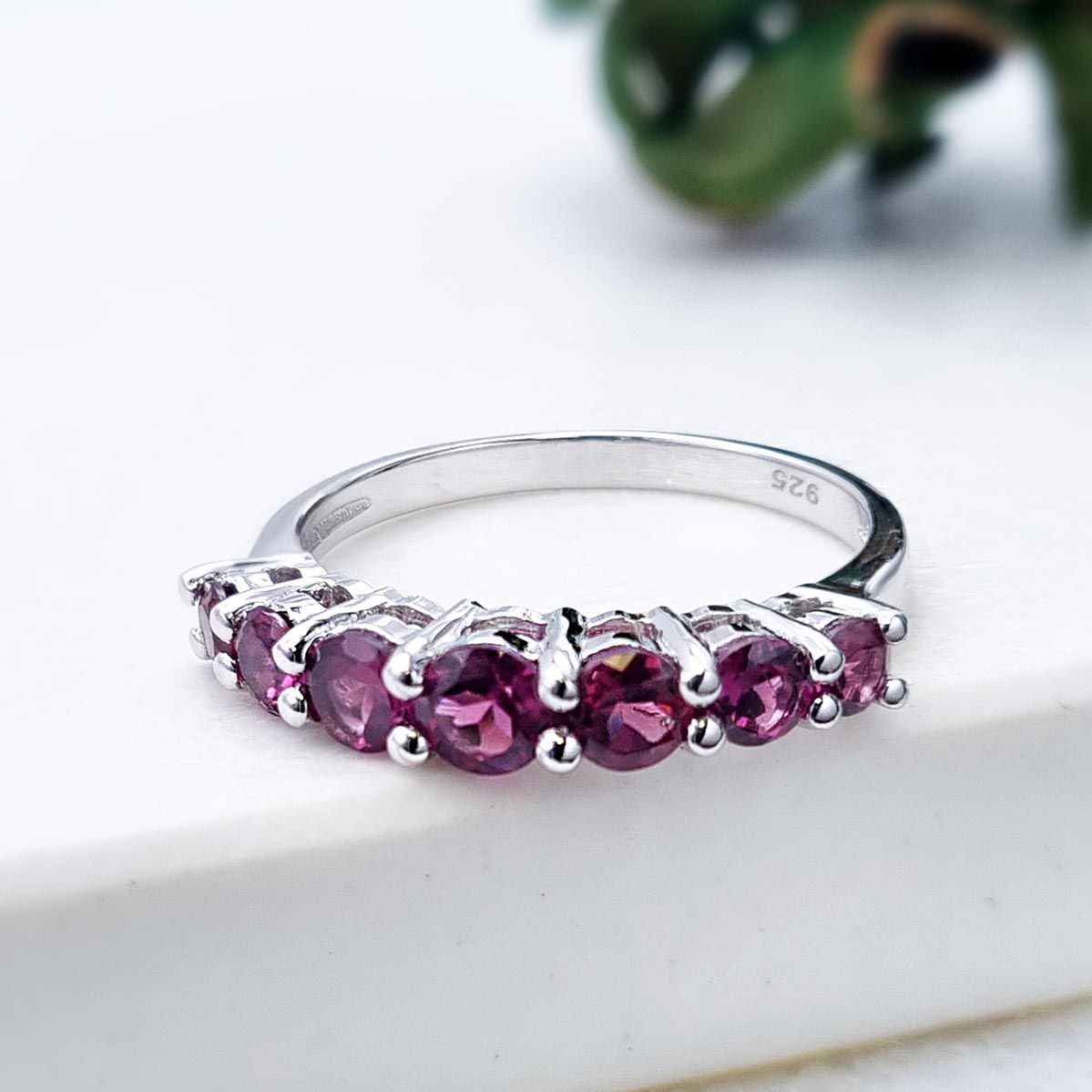 Srebrny pierścionek wykonany z rodowanego srebra próby 925 z 7 naturalnymi granatami rodolit.