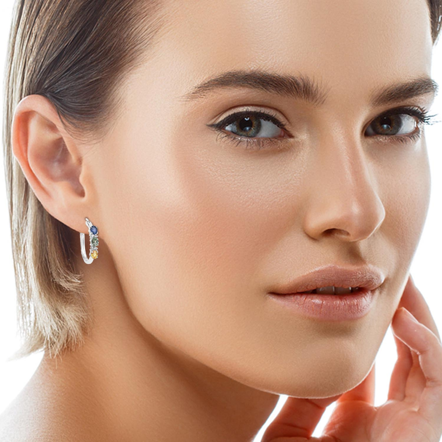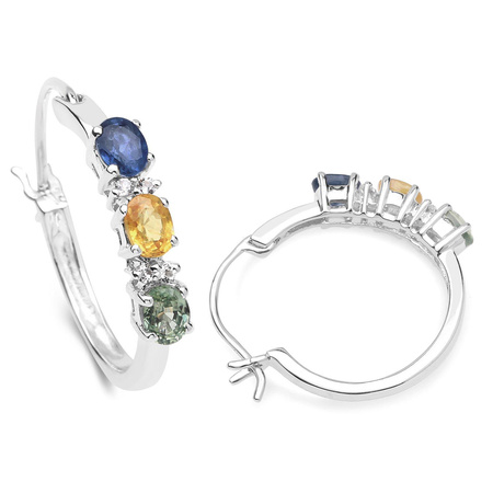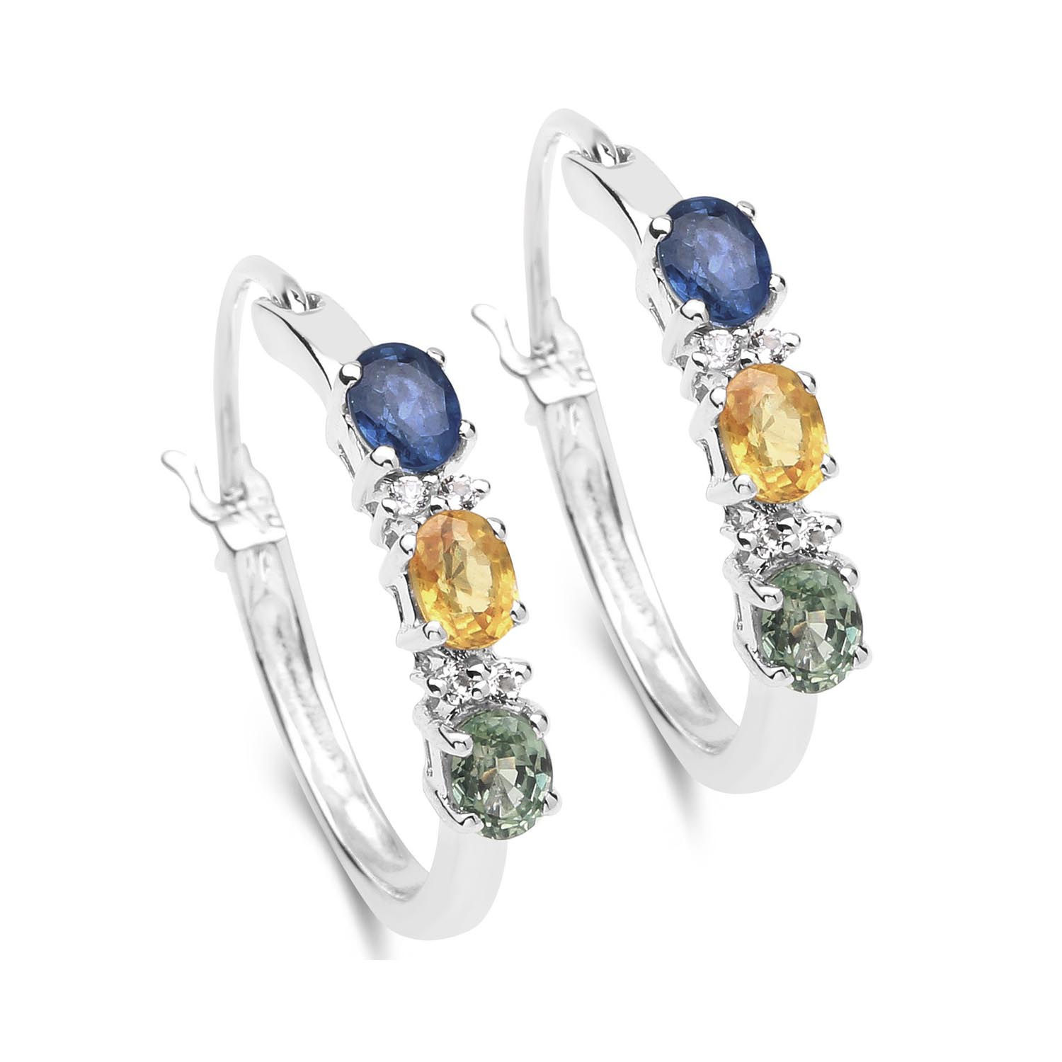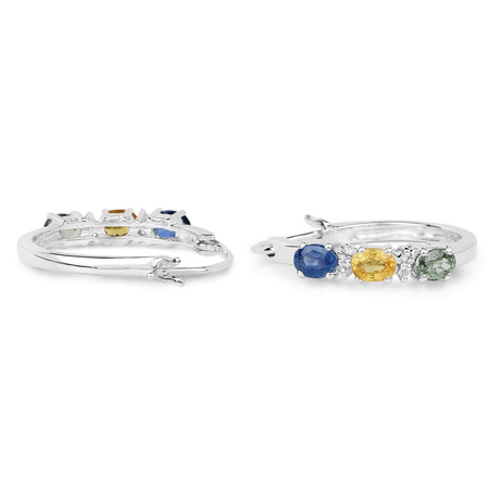 Naturalny szafir niebieski: Ilość/Waga: 2/0.44 ct, Kształt/Wielkość: Owalny/4x 3 mm Naturalny szafir zielony: Ilość/Waga: 2/0.50 ctw, Kształt/Wielkość: Owalny/4x 3 mm Naturalny szafir żółty: Ilość/Waga: 2/0.50 ctw , Kształt/Wielkość: Owalny/4x 3 mm Naturalny kryształ górski: Ilość/Waga: 8/0.12 ct, Kształt/Wielkość: Owalny/4x3 mmWielkość kolczyków: szerokość: 3 mm; średnica kolczyków: 17 mmWłaściwości kamieni