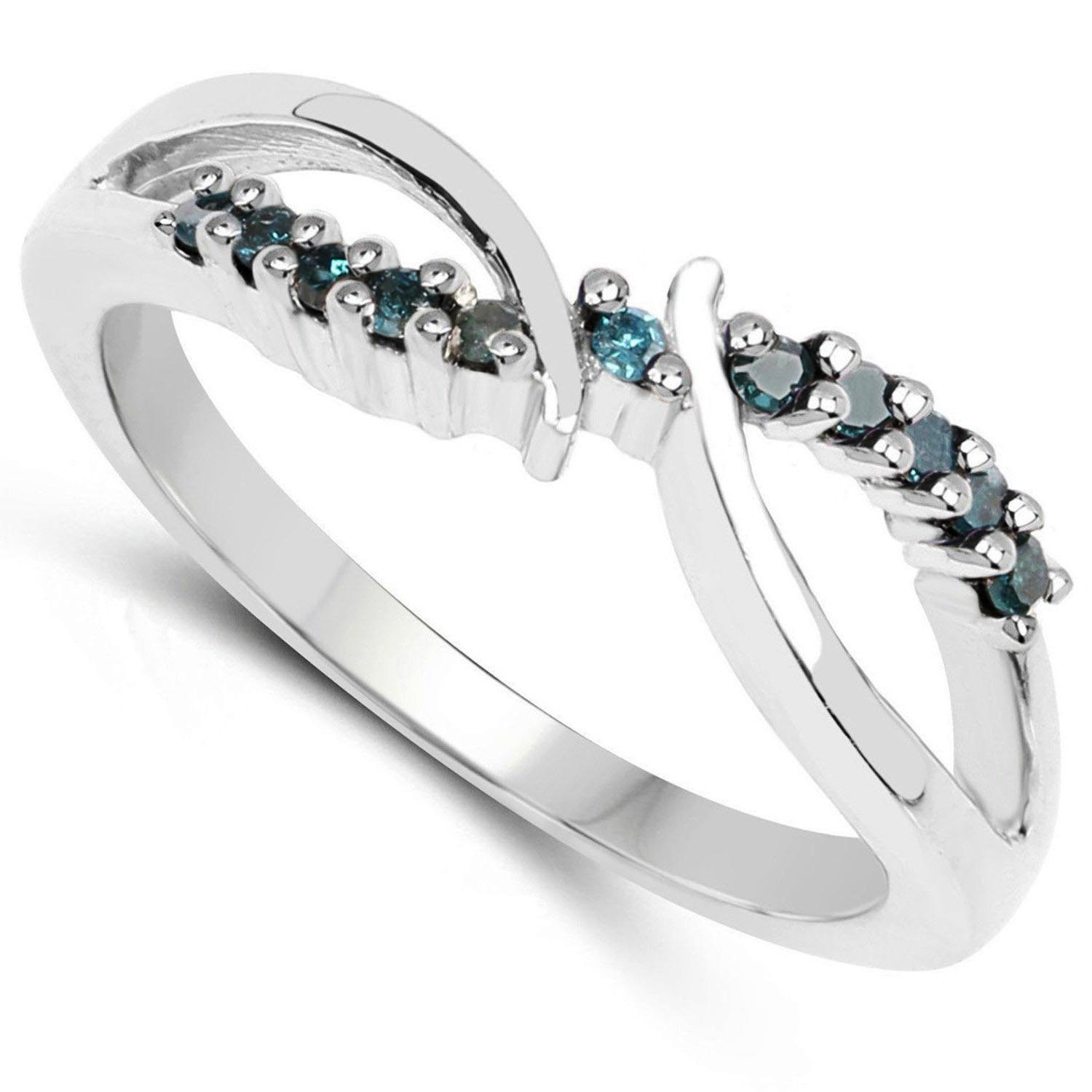 Delikatny srebrny pierścionek z naturalnymi niebieskimi diamentami. Wykonany ze srebra rodowanego próby 925. Niebieskie diamenty wspaniale kontrastuje z rodowanym, błyszczącym srebrem.