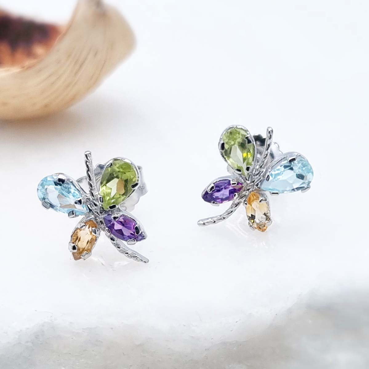 Delikatne srebrne kolczyki z naturalnymi topazami niebieskimi, perydotami, cytrynami i ametystami, osadzonymi w rodowanym srebrze próby 925.