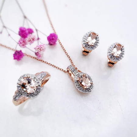 Przepiękny komplet biżuterii, składający się z kolczyków, pierścionka, łańcuszka oraz wisiorka, wysadzany naturalnymi morganitami i kryształami górskimi, wykonany ze srebra najwyższej próby 925, pozłacany 14 ct różowym złotem.