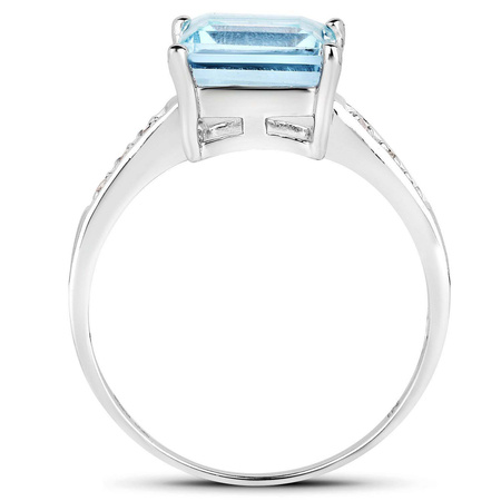 Elegancki srebrny pierścionek wykonany z lśniącego rodowanego srebra próby 925 z bardzo dużym naturalnym topazem niebieskim o kwadratowym szlifie i diamentami.