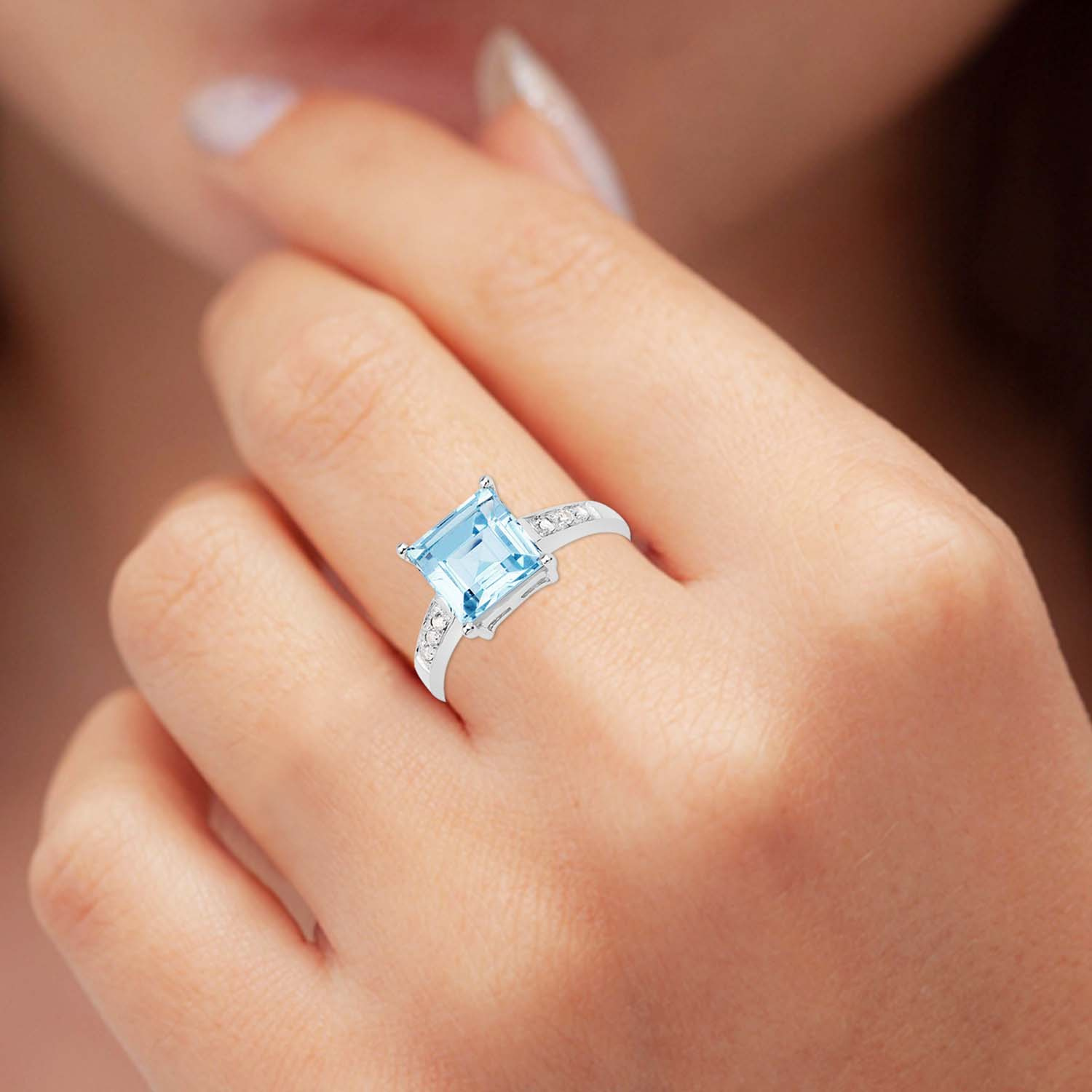 Naturalny topaz niebieski: Ilość/Waga: 1/3.00 ct, Kształt/Wielkość: Kwadratowy/8 mmNaturalny diament : Ilość/Waga: 6/0.06 ct, Kształt/Wielkość: Okrągły/1.3 mmWielkość korony pierścionka: ok. 8x8 mmWłaściwości kamieni