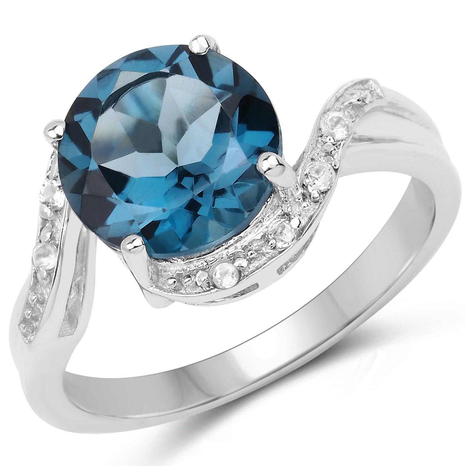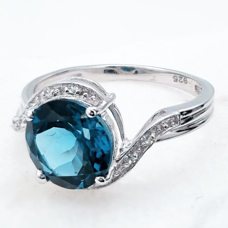 Majestatyczny pierścionek wykonany z lśniącego rodowanego srebra najwyższej próby 925. Największym atutem pierścionka jest piękny 3,33 karatowy naturalny topaz niebieski London Blue. Pierścionek zdobi dodatkowo 8 kryształów górskich.