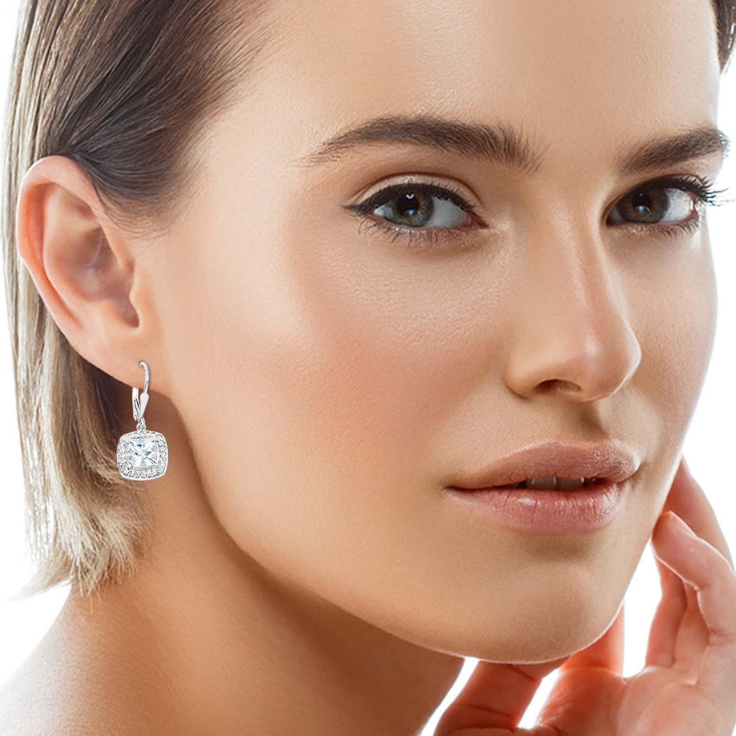 Urokliwe srebrne kolczyki z 2 naturalnymi akwamarynami i 48 kryształami górskimi, osadzonymi w rodowanym srebrze próby 925.