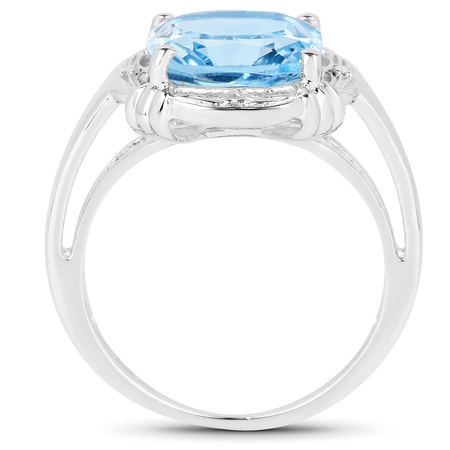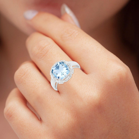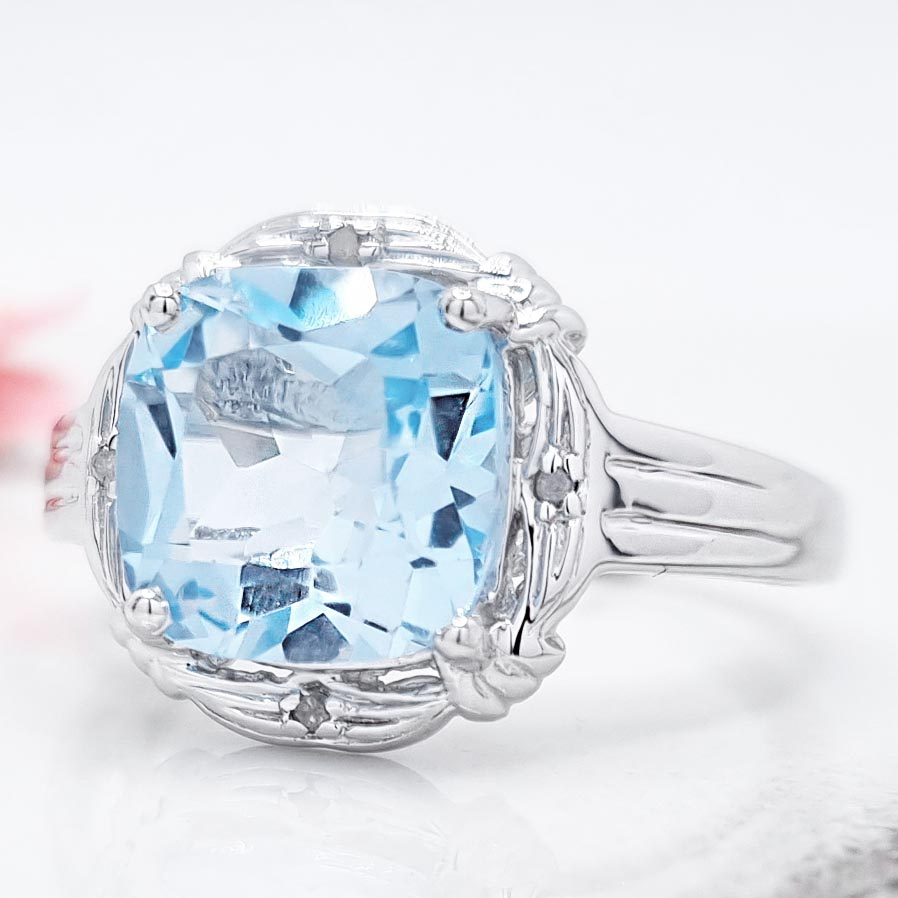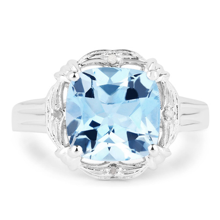 Naturalny topaz niebieski: Ilość/Waga: 1/3.25 ct, Kształt/Wielkość: Poduszka/10 mmNaturalny diament: Ilość/Waga: 4/0.04 ct, Kształt/Wielkość: Okragły/1 mm Wielkość korony pierścionka: ok. 14x14 mmWłaściwości kamieni