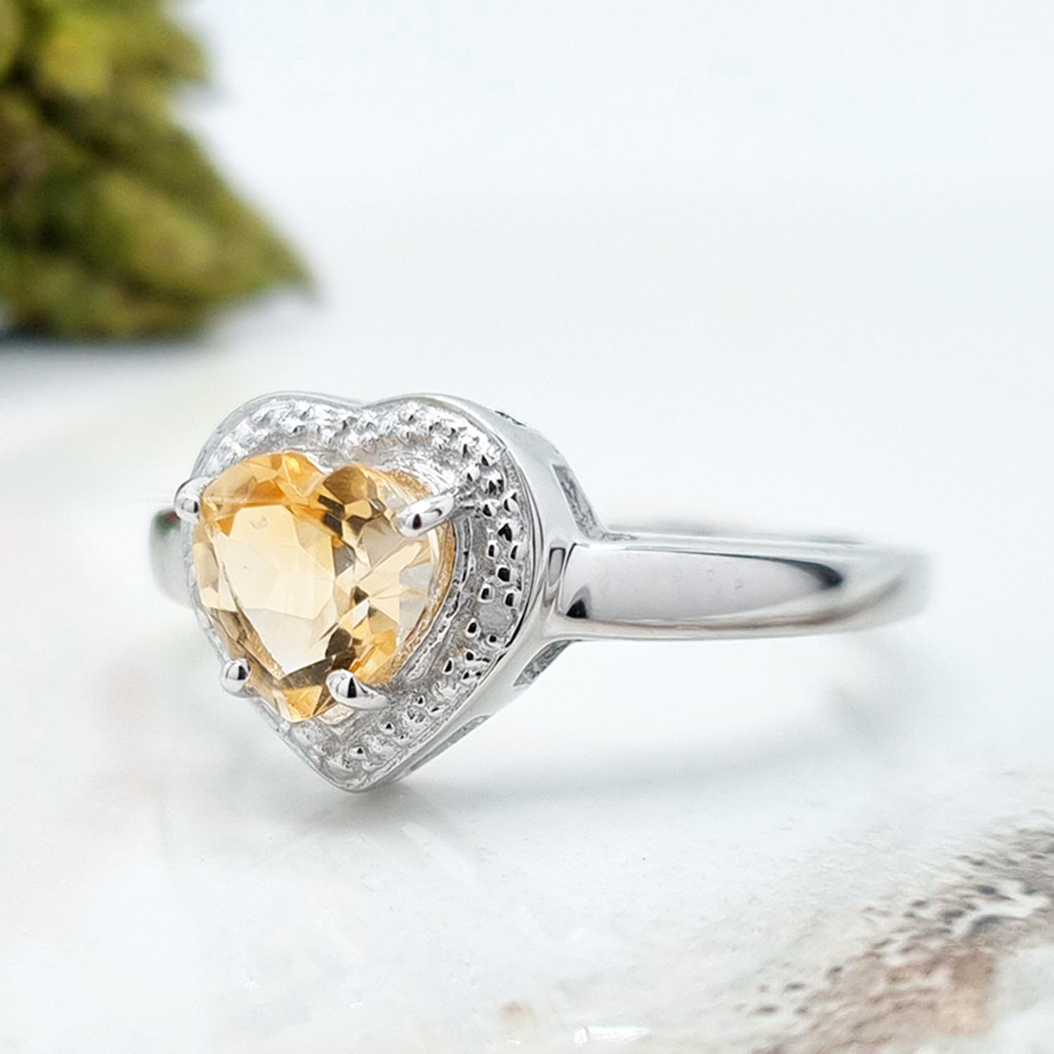 Naturalny cytryn: Ilość/Waga: 1/1.00 ct, Kształt/Wielkość: Serce/7 mmNaturalny diament : Ilość/Waga: 2/0.01 ct, Kształt/Wielkość: Okrągły/0.90 mm, Czystość/Kolor: I2-I3/I-JWielkość korony pierścionka: ok. 11x11 mm