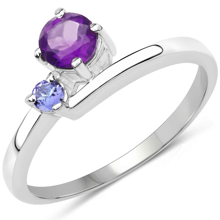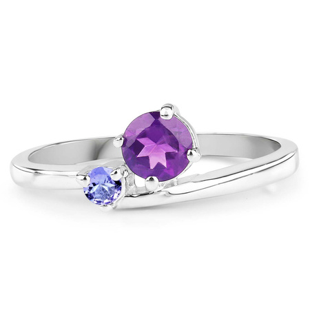 Klasyczny srebrny pierścionek z naturalnymi: ametystem i tanzanitem. Pierścionek ze srebra rodowanego próby 925.