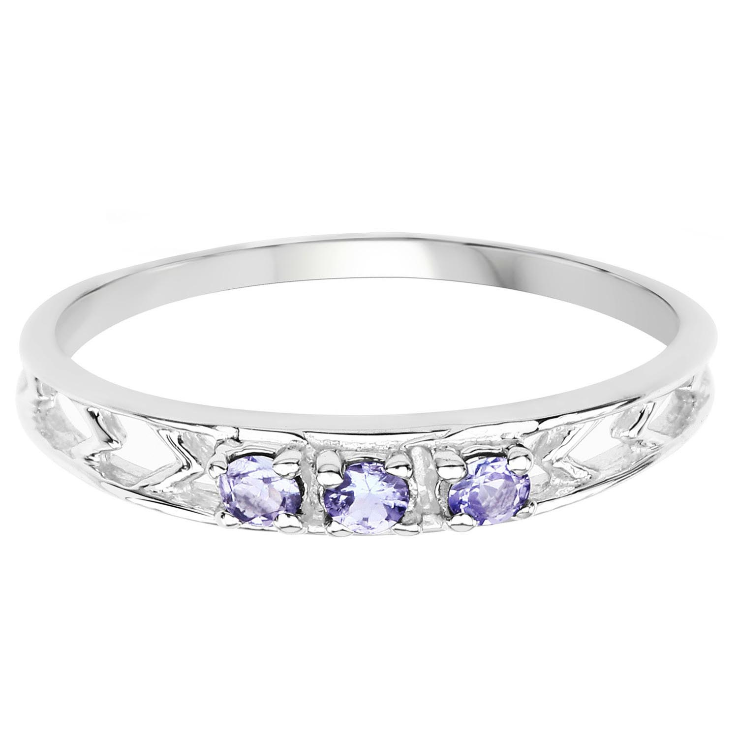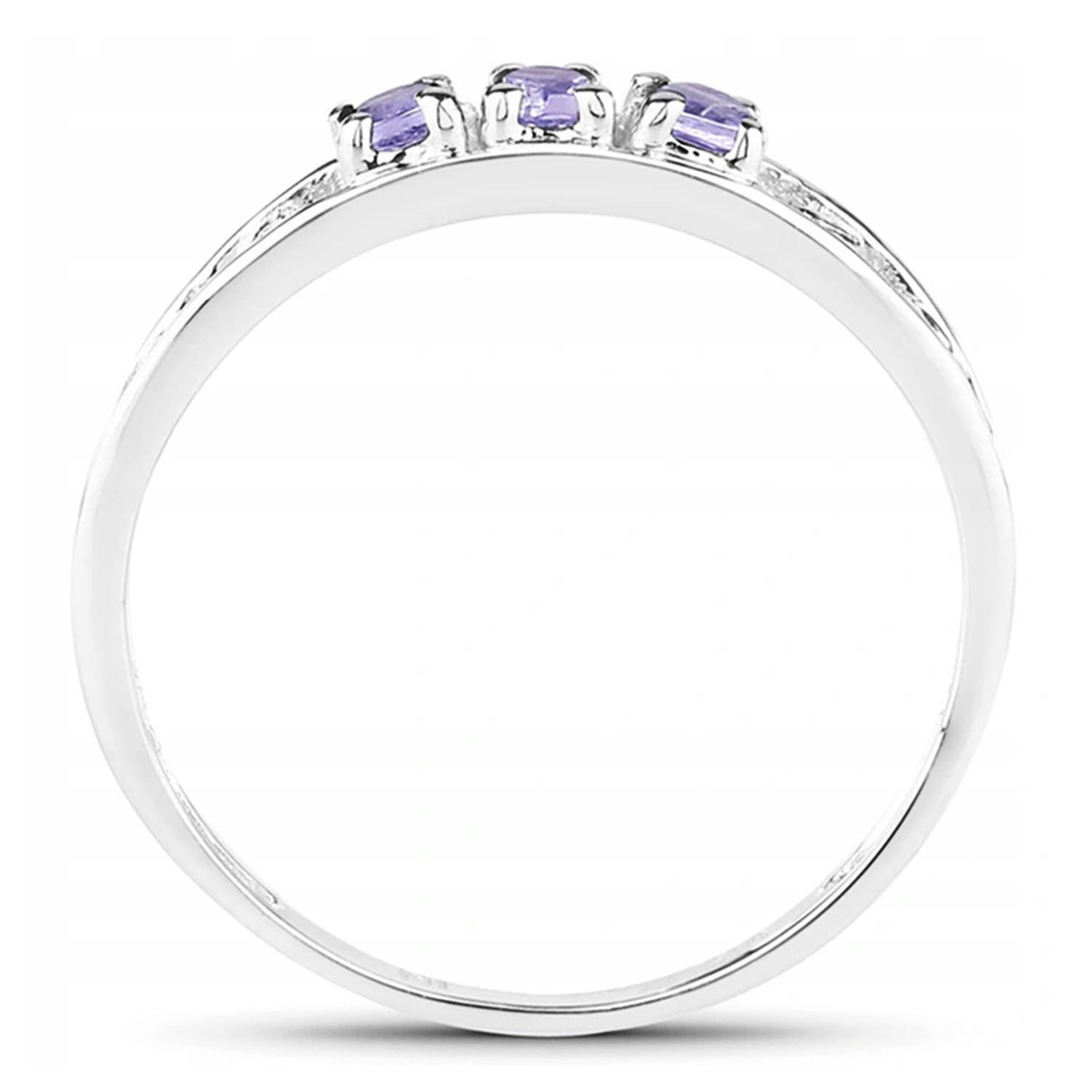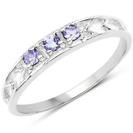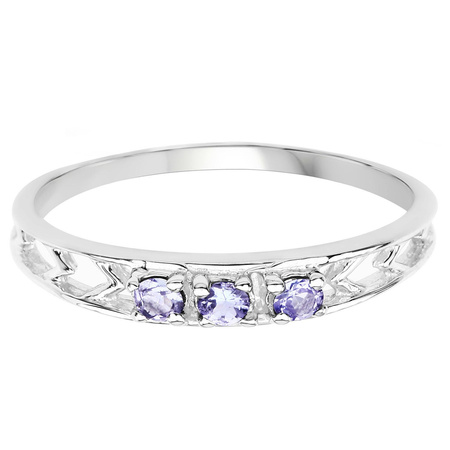 Prosty klasyczny pierścionek z 3 naturalnymi tanzanitami, osadzonymi w rodowanym srebrze najwyższej próby 925.