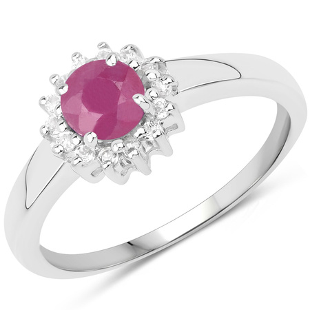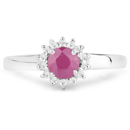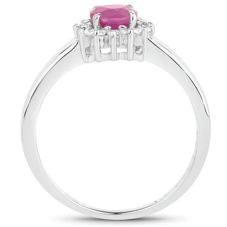Elegancki pierścionek o ponadczasowym wzorze wykonany z lśniącego rodowanego srebra próby 925 z pięknym naturalnym afrykańskim rubinem otoczonym 14 cyrkoniami.