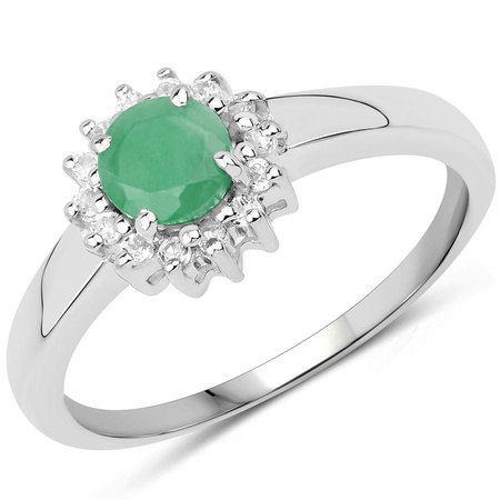 Prześliczny srebrny pierścionek z naturalnym szmaragdem oraz 14 kryształami górskimi, osadzonymi w pięknym rodowanym srebrze najlepszej próby 925.