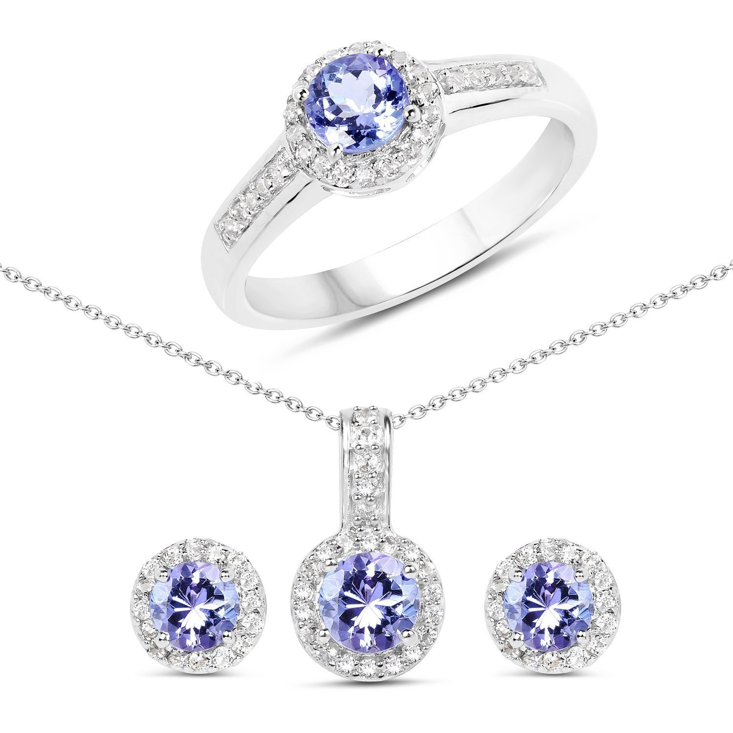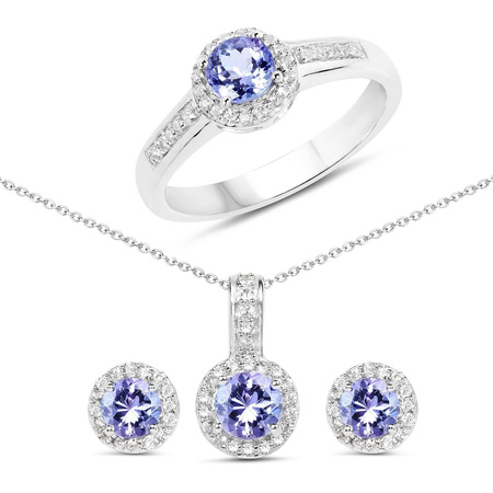 Naturalny tanzanit: Ilość/Waga: 2/0.94 ct i 2/0.46 ct, Kształt/Wielkość: 2/Okrągły/ 5 mm i 2/Okrągły/4 mmNaturalny kryształ górski: Ilość/Waga: 82/0.42 ct, Kształt/Wielkość: Okrągły/1 mmWielkość kolczyków: ok. 6x6 mmWielkość wisiorka: ok. 13x7 mmDługość łańcuszka: ok. 45 cmWielkość korony pierścionka: ok. 7 mm