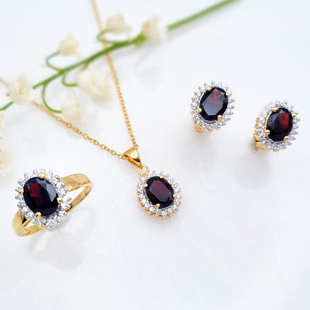 Elegancki srebrny komplet biżuterii składający się z pierścionka, kolczyków, łańcuszka oraz wisiorka, wykonany ze srebra próby 925, pokrytego 14 ct żółtym złotem, i wysadzany naturalnymi granatami i 80 cyrkoniami.