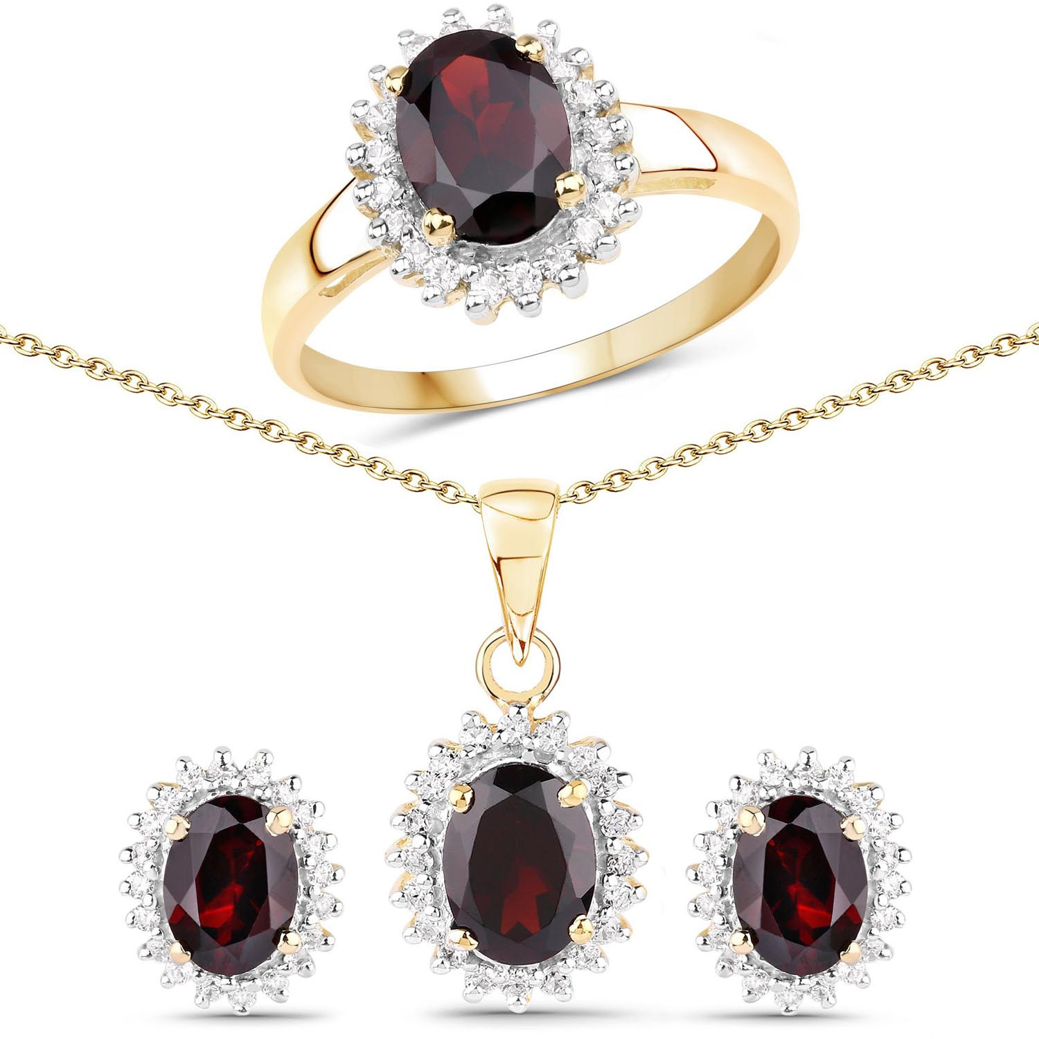 Naturalny granat: Ilość/Waga: 4/6.40 ct, Kształt/Wielkość: Owal/8x6 mmCyrkonia: Ilość/Waga: 80/0.80 ct, Kształt/Wielkość: Okrągły/1.30 mmWielkość wisiorka: ok. 20x11 mmWielkość kolczyków: ok. 13x11 mmWielkość korony pierścionka: ok. 13x11 mmDługość łańcuszka: ok. 45 cmRozmiar: 17Właściwości kamieni