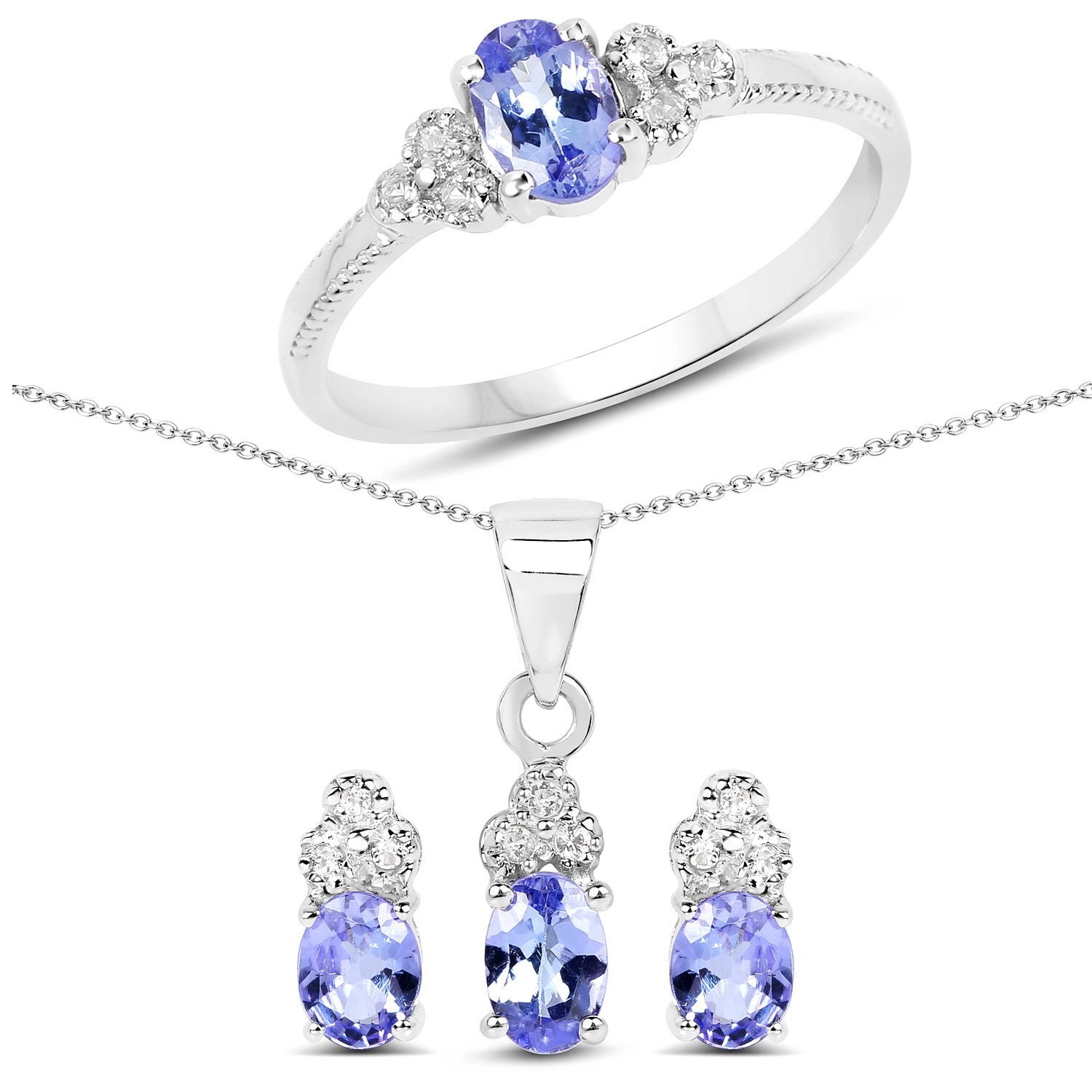 Naturalny tanzanit: Ilość/Waga: 4/1.54 ct, Kształt/Wielkość: Owal/ 2/6x4 mm; 2/5x4 mmNaturalny kryształ górski: Ilość/Waga: 15/0.12 ct, Kształt/Wielkość: Okrągły/1-1.2 mmWielkość kolczyków: ok. 8x3 mmWielkość wisiorka: ok. 18x5 mmDługość łańcuszka: ok. 45 cmWielkość korony pierścionka: ok. 10x6 mmWłaściwości kamieni