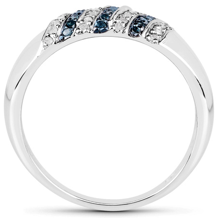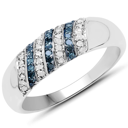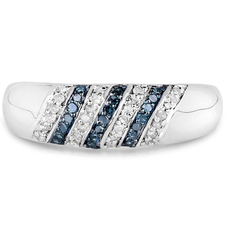 Piękny srebrny pierścionek z 28 białymi diamentami i 21 niebieskimi diamentami. Wykonany ze srebra rodowanego próby 925.
