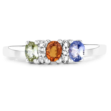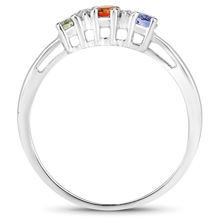 Naturalny szafir zielony: Ilość/Waga: 1/0.20 ct, Kształt/Wielkość: Owal/4x3 mmNaturalny szafir pomarańczowy: Ilość/Waga: 1/0.20 ct, Kształt/Wielkość: Owal/4x3 mmNaturalny szafir niebieski: Ilość/Waga: 1/0.20 ct, Kształt/Wielkość: Owal/4x3 mmNaturalny kryształ górski: Ilość/Waga: 2/0.1 ct, Kształt/Wielkość: Okrągły/ 1 mmWielkość korony pierścionka: ok. 12x5 mmWłaściwości kamieni