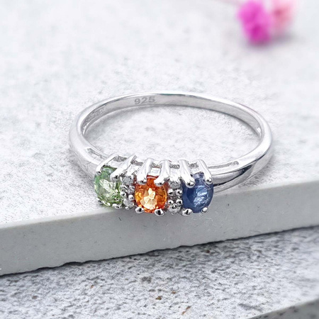 Naturalny szafir zielony: Ilość/Waga: 1/0.20 ct, Kształt/Wielkość: Owal/4x3 mmNaturalny szafir pomarańczowy: Ilość/Waga: 1/0.20 ct, Kształt/Wielkość: Owal/4x3 mmNaturalny szafir niebieski: Ilość/Waga: 1/0.20 ct, Kształt/Wielkość: Owal/4x3 mmNaturalny kryształ górski: Ilość/Waga: 2/0.1 ct, Kształt/Wielkość: Okrągły/ 1 mmWielkość korony pierścionka: ok. 12x5 mmWłaściwości kamieni
