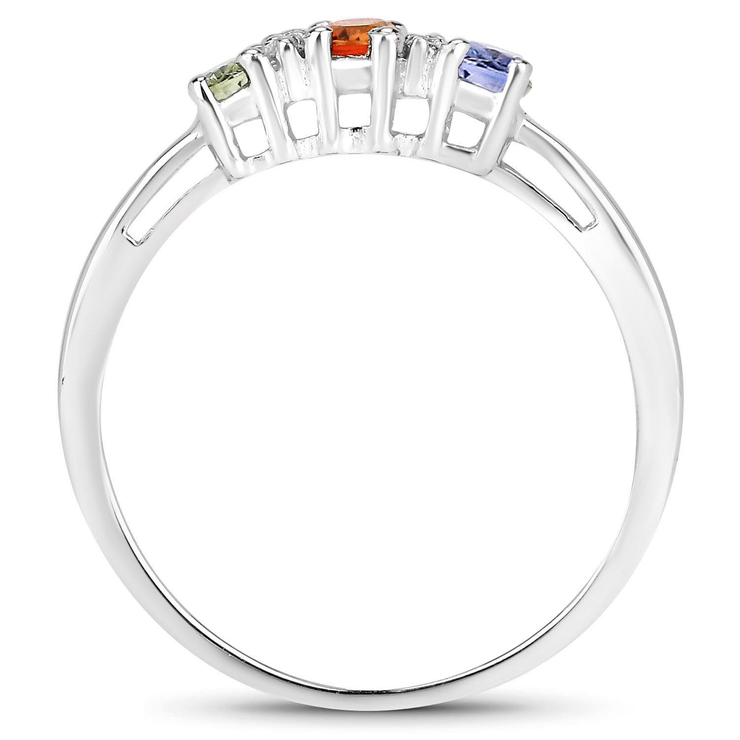 Naturalny szafir zielony: Ilość/Waga: 1/0.20 ct, Kształt/Wielkość: Owal/4x3 mmNaturalny szafir pomarańczowy: Ilość/Waga: 1/0.20 ct, Kształt/Wielkość: Owal/4x3 mmNaturalny szafir niebieski: Ilość/Waga: 1/0.20 ct, Kształt/Wielkość: Owal/4x3 mmNaturalny kryształ górski: Ilość/Waga: 2/0.1 ct, Kształt/Wielkość: Okrągły/ 1 mmWielkość korony pierścionka: ok. 12x5 mm