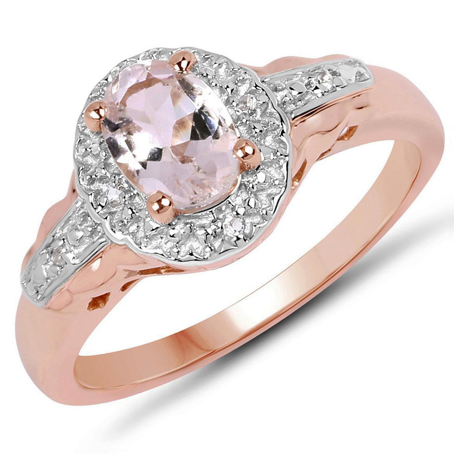 Uroczy pierścionek z prześlicznym jasnoróżowym naturalnym morganitem i kryształami górskimi. Pierścionek wykonany ze srebra rodowanego próby 925, pozłacany warstwą 14 ct różowego złota.