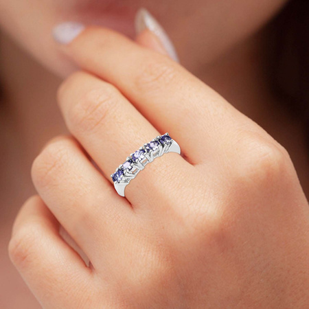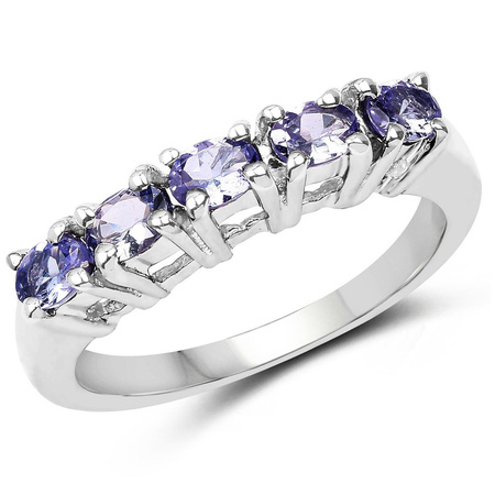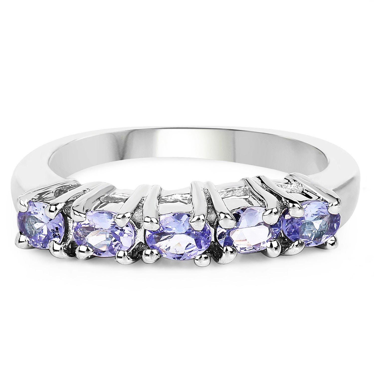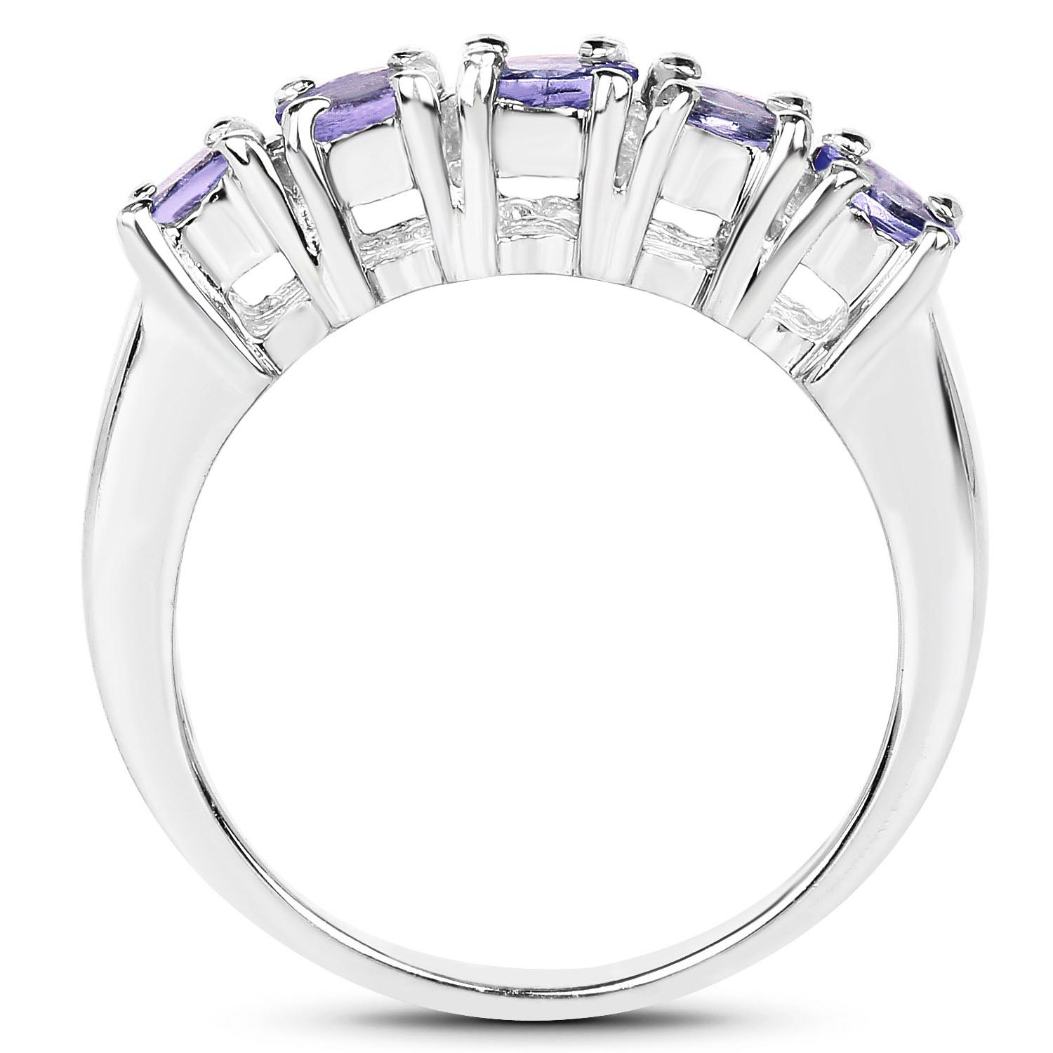 Klasyczny srebrny pierścionek z 5 naturalnymi tanzanitami osadzonymi w rodowanym srebrze najwyższej próby 925.