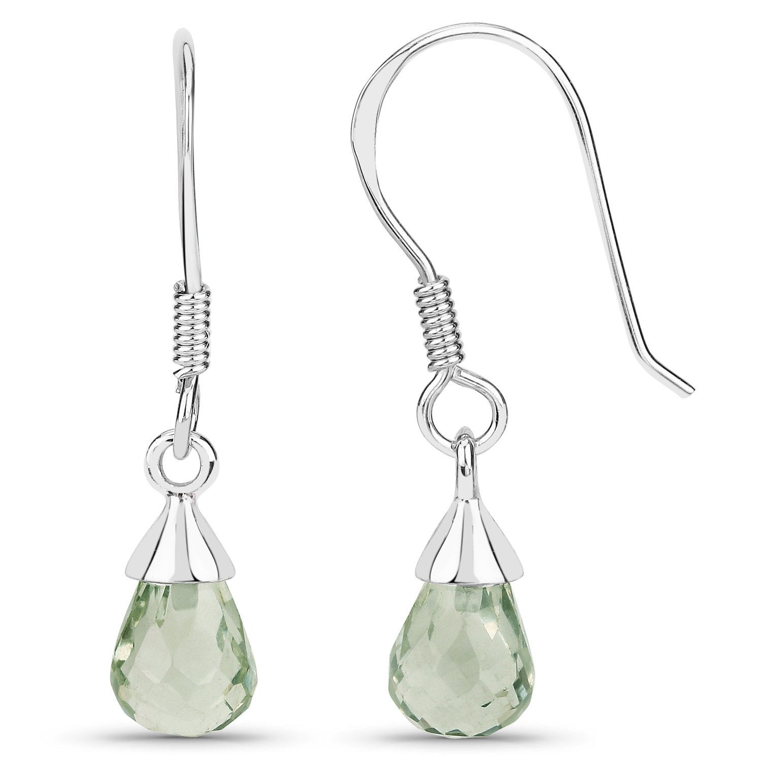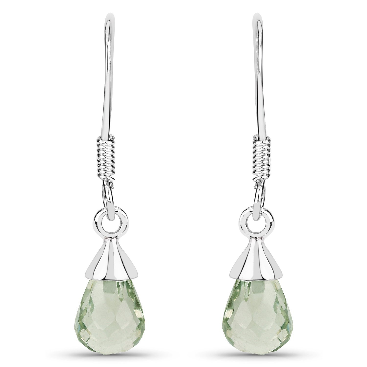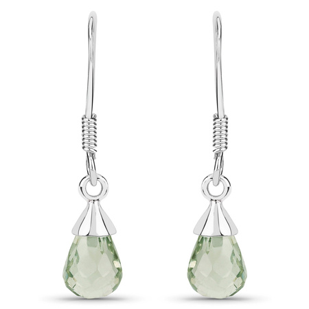 Klasyczny srebrny komplet biżuterii, złożony z kolczyków, łańcuszka i wisiorka, wykonany z rodowanego srebra próby 925, wysadzany naturalnymi zielonymi ametystami.