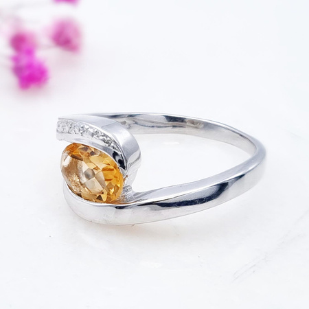 Piękny srebrny pierścionek o klasycznym wzorze, z naturalnym brazylijskim cytrynem, wykonany z rodowanego srebra próby 925.