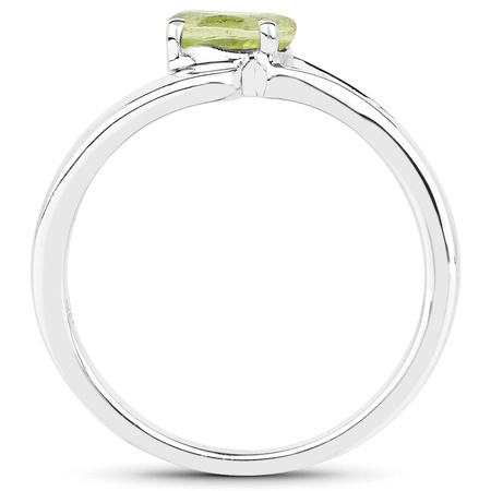 Subtelny srebrny pierścionek z naturalnym perydotem o przepięknej zielonej barwie, osadzonym w rodowanym srebrze próby 925.
