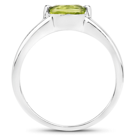 Subtelny srebrny pierścionek z naturalnym perydotem o przepięknej zielonej barwie, osadzonym w rodowanym srebrze próby 925.
