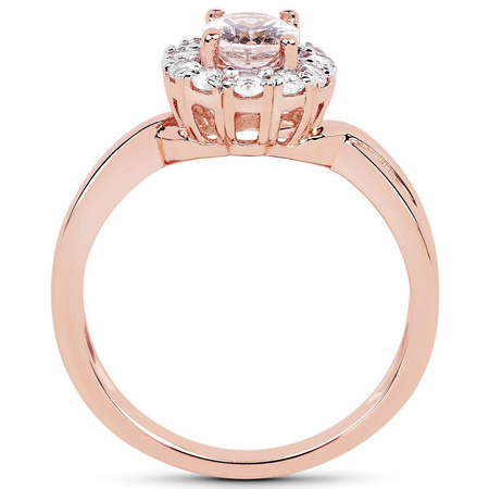 Uroczy pierścionek z prześlicznym jasnoróżowym naturalnym morganitem i kryształami górskimi. Pierścionek wykonany ze srebra rodowanego próby 925, pozłacany warstwą 14 ct różowego złota.