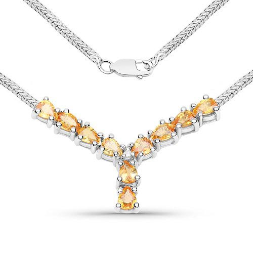 Elegancki srebrny naszyjnik z 10 naturalnymi szafirami żółtymi i diamentem, wykonany z błyszczącego rodowanego srebra próby 925.