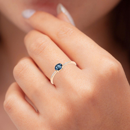 Złoty pierścionek z naturalnym topazem London blue oraz 14 diamentami, wykonany z żółtego złota próby 417.