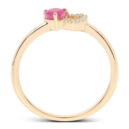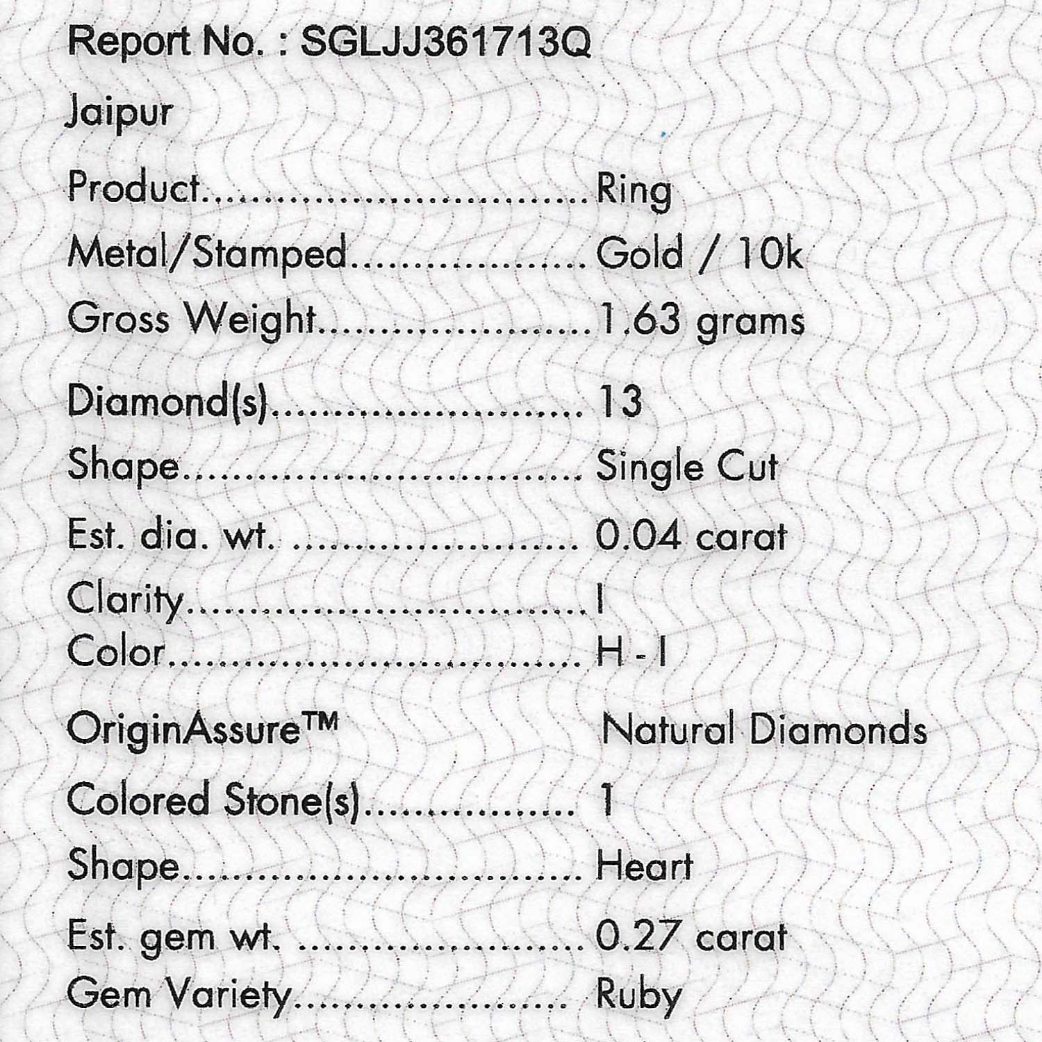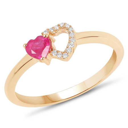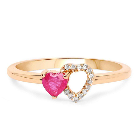 Naturalny rubin: Ilość/Waga: 1/0.27 ct, Kształt/Wielkość: Serce/4 mmNaturalny diament : Ilość/Waga: 13/0.04 ct, Kształt/Wielkość: Okrągły/0.80 mmWielkość korony pierścionka: ok. 6x8x4 mmWłaściwości kamieni
