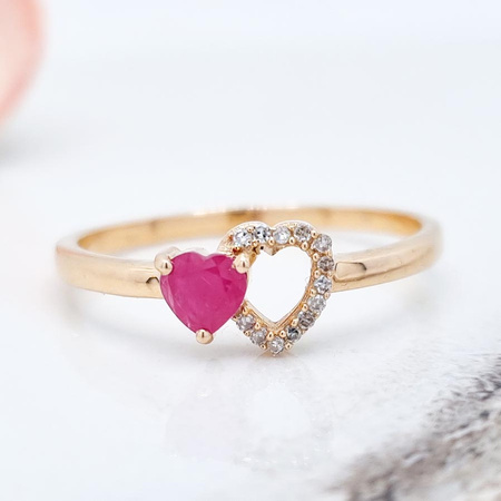 Nasz pierścionek złoty z rubinem jest symbolem połączenia dwóch kochających się serc . Centralnym punktem tego złotego pierścionka jest głęboki czerwony rubin w kształcie serca o intensywnym blasku, który symbolizuje mocną i płomienną miłość. ❤️ Rubinowe serce jest w wiecznym i nierozerwalnym splocie z sercem diamentowym. Drugie serce otaczają lśniące diamenty, które dodają całej kompozycji wyjątkowego uroku i przyciągają wzrok każdego, kto spojrzy na ten piękny klejnot.
