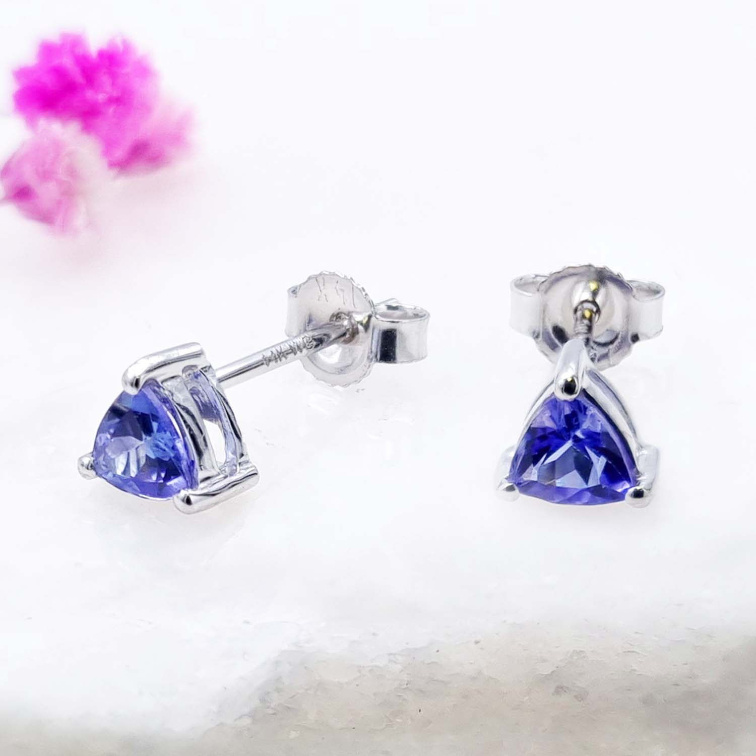 Naturalny tanzanit: Ilość/Waga: 2/0.50 ct, Kształt/Wielkość: Trillion/4 mmWielkość kolczyków: ok. 5x5x4 mmWłaściwości kamieni