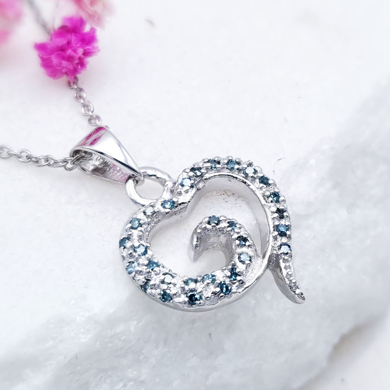 Zjawiskowy wisiorek srebrny z naturalnymi niebieskimi diamentami o prześlicznej barwie. 29 okrągłych diamentów, tworzących kształt serca, przepięknie kontrastuje z lśniącym rodowanym srebrem próby 925.