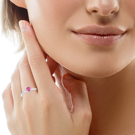 Romantyczny pierścionek z naturalnym rubinem osadzonym w lśniącym rodowanym srebrze najlepszej próby 925 i 2 kryształami górskimi.