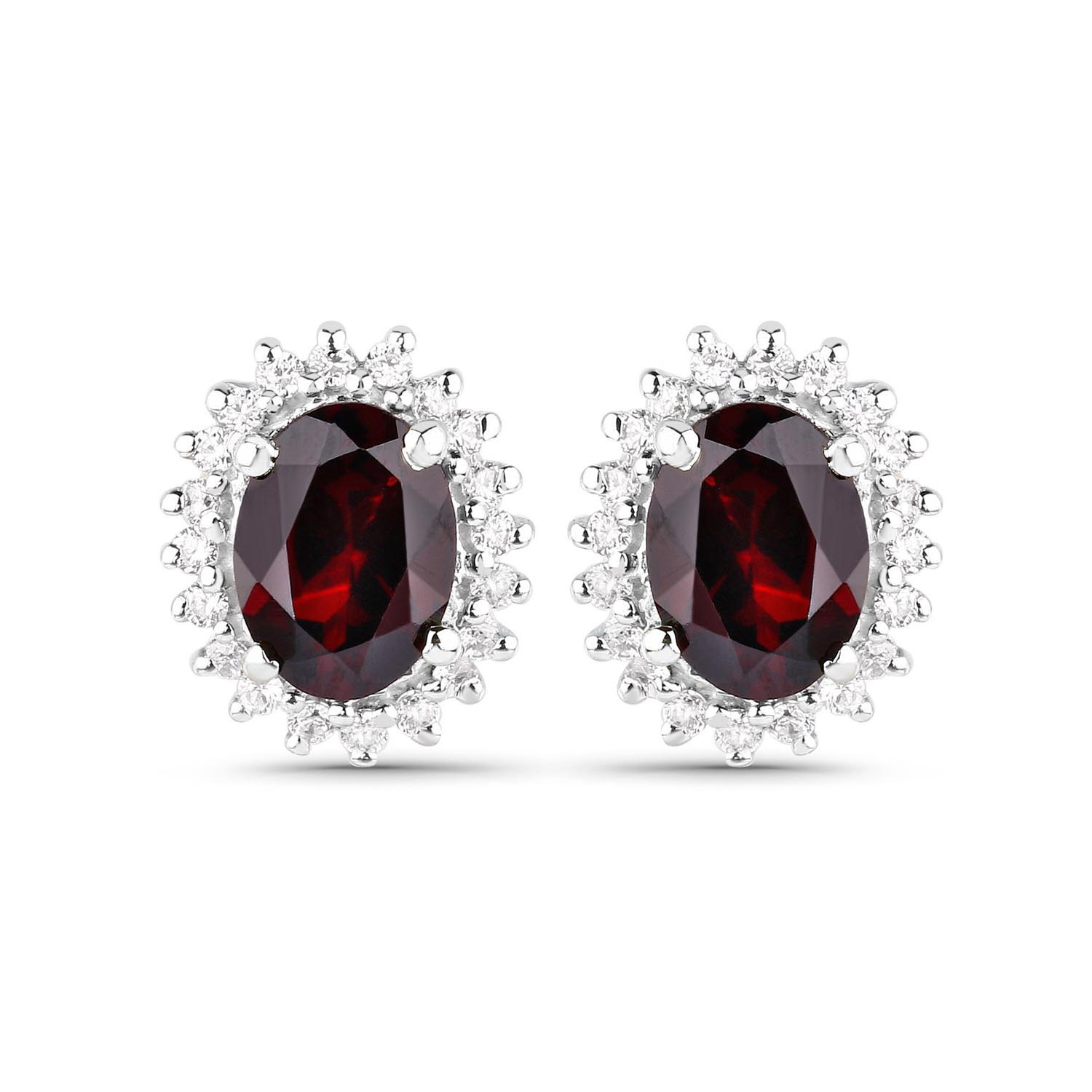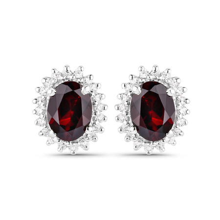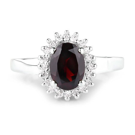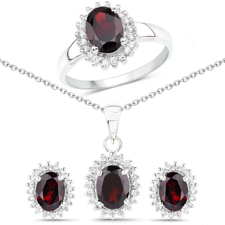 Cyrkonia: Ilość/Waga: 80/0.80 ct, Kształt/Wielkość: Okrągły/1.30 mmNaturalny granat: Ilość/Waga: 4/6.40 ct, Kształt/Wielkość: Owal/8x6 mmWielkość wisiorka: ok. 20x11 mmWielkość kolczyków: ok. 13x11 mmWielkość korony pierścionka: ok. 13x11 mmDługość łańcuszka: ok. 45 cmRozmiar: 17Właściwości kamieni