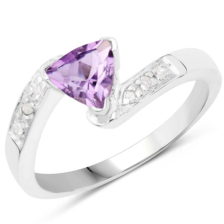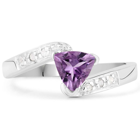 Naturalny ametyst: Ilość/Waga: 1/0,70 ct, Kształt/Wielkość: Trylion/6 mmNaturalny diament : Ilość/Waga: 6/0,05 ct, Kształt/Wielkość: Okrągły/1,20 mmWielkość korony pierścionka: ok. 7x7 mm